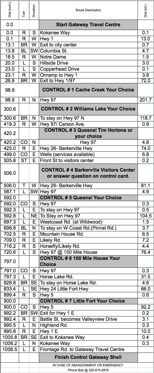 0 Kamloops 98 98 Cache Creek 113 211 100 Mile house 204 415 Quesnel 86 501 Barkerville 86 586 Quesnel 119 705 Williams Lake 91 796 100 Mile House 134 930 Barriere 76 1006 Kamloops (75 hour limit) |