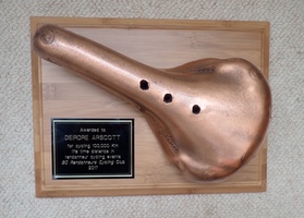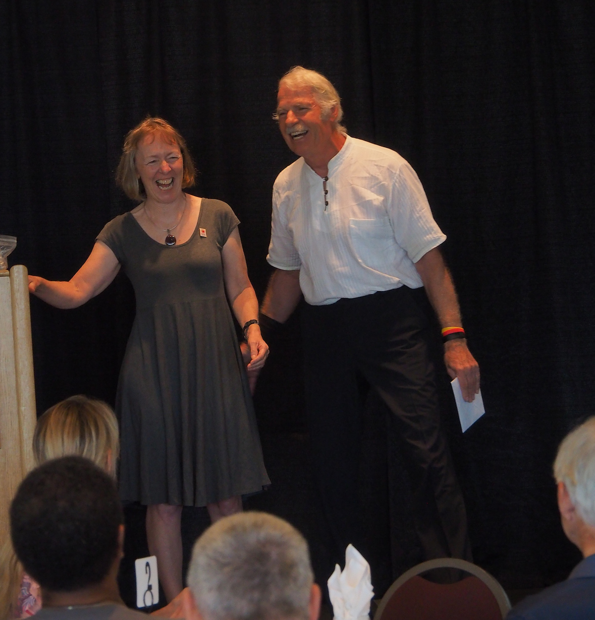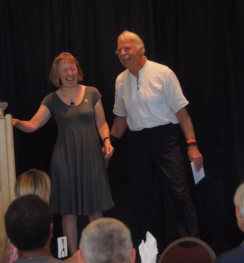 Deirdre Arscott received her 100,000 km award at the 2017 Spring Social. This photo is from the banquet following the 2016 Rocky Mountain 1200. (Pictured here with Manfred Kuchenmuller.) Photo: Stephen Hinde.