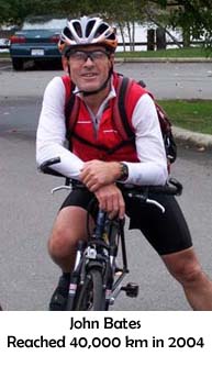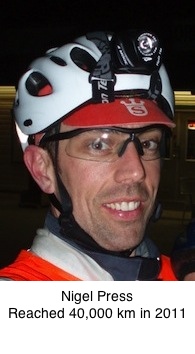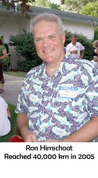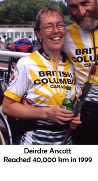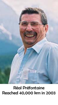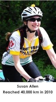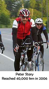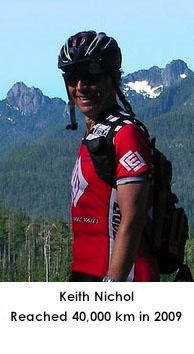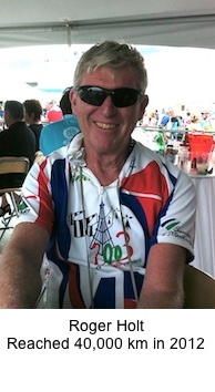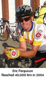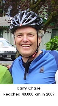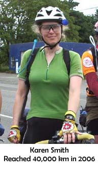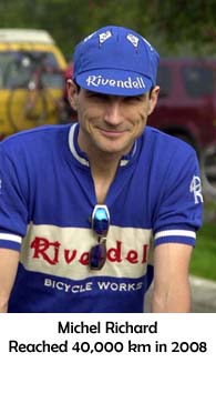 The 40,000 pin is awarded to a BC randonneur whose life-time event distance (brevet/fleches) reaches 40,000 km. As with the Hathaway ("Iron Butt") award, the rides can be ridden anywhere in the world assuming that the rides are recognized by ACP or RM. All BC randonneur club members who live in BC are eligible for the award. Riders who don't live in BC are also eligible for the award if they have ridden at least 20,000 km in BC randonneurs brevet/fleches. Why 40,000? 40,000 km is almost exactly the circumference of the earth. Ride around the world once (in events), you get the pin! Concept of the award by Michel Richard. First awarded in advance of the 2006 season. Here is the growing group riders in club 40. (Click images for bonus pictures.) |
