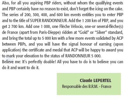 (200, 300, 400, and 600 km), a 1000 km, a Flèche Velocio or equivalent (Flèche Pacifique in BC, 360+ km), and a Paris - Brest - Paris (1200 km).