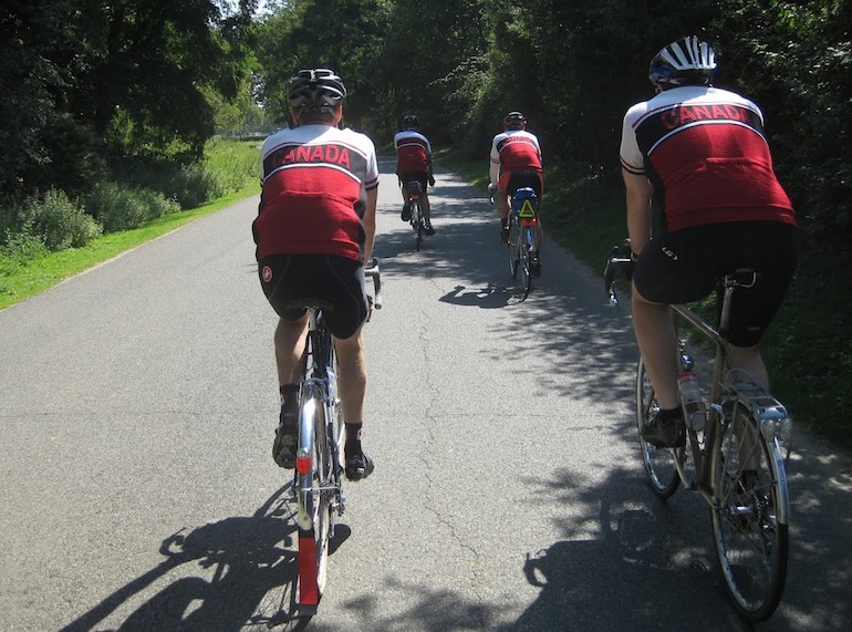 There were long and short sleeve versions, and woman's sizing. There was also a lycra Canada jersey for PBP 2011. The project was organized by Mark Beaver in Nova Scotia, and the design was a variation on the 2003 and 2007 Canada jersey designs. Collin Fingler got one. |