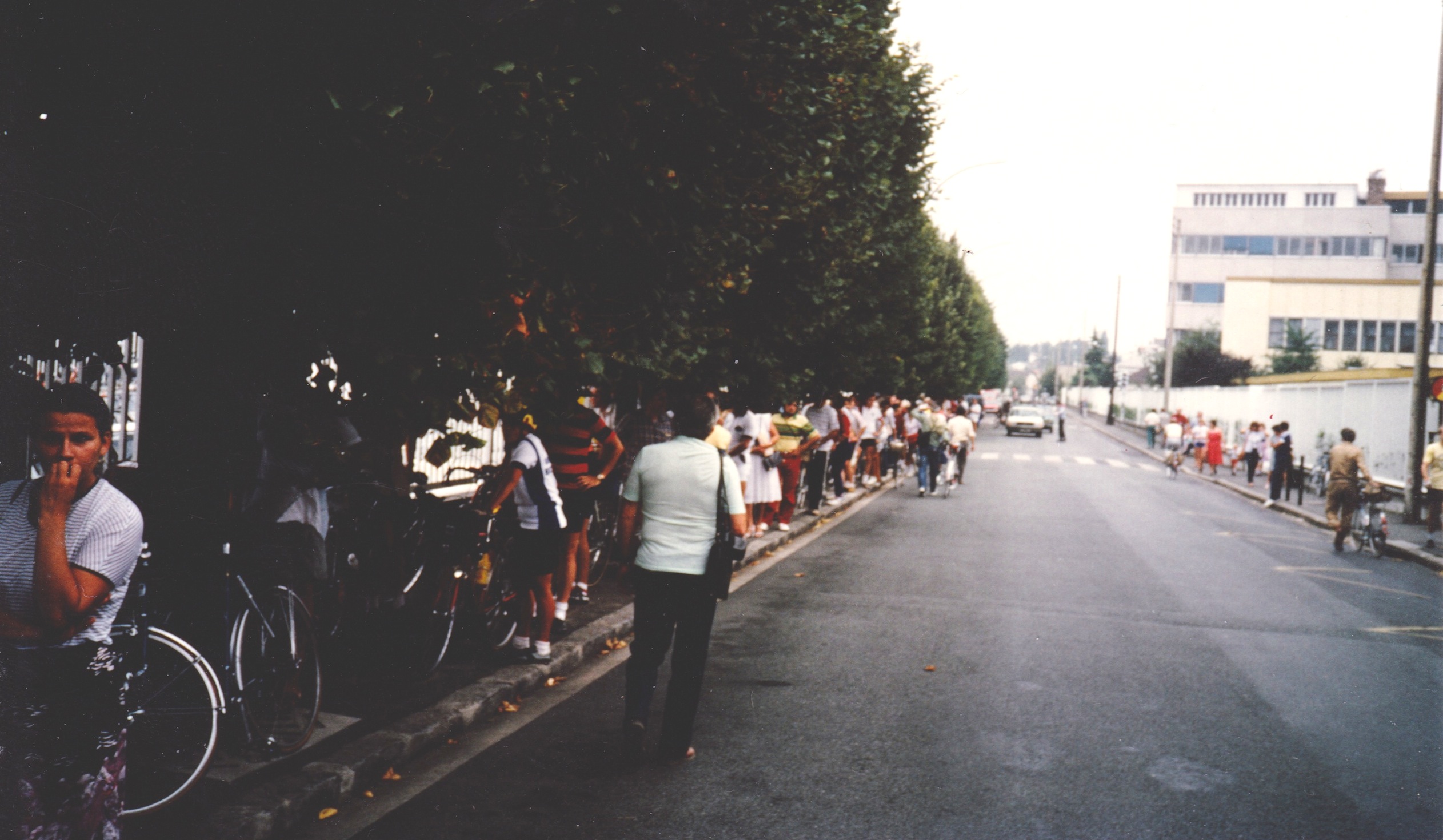 Before PBP 1983. Dan McGuire slightly visible on sidewalk - striped red shirt, hand on hip. June Gallagher beside him, white jersey.