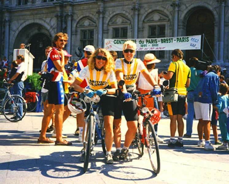 Karen Smith and Judy Morrison. PBP 1991 prologue (ceremonial ride) starting at Paris city hall.
