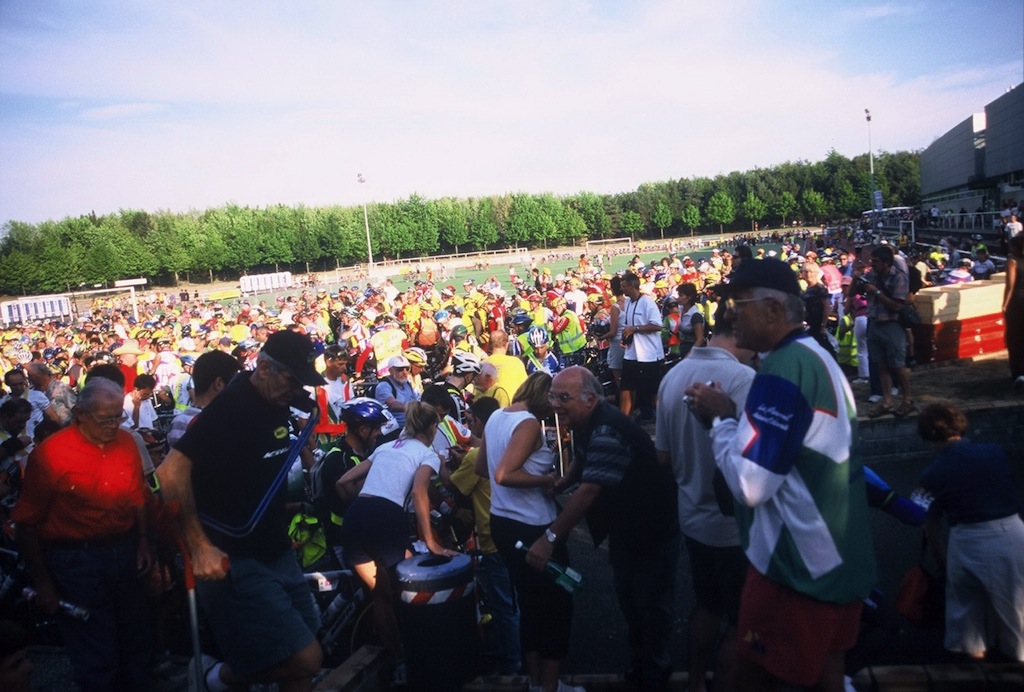 Keith Fraser (center left in photo, white helmet) checked through into start holding area by Noel Simpson. Harold Bridge in cap, pale blue shirt, cool shades.
