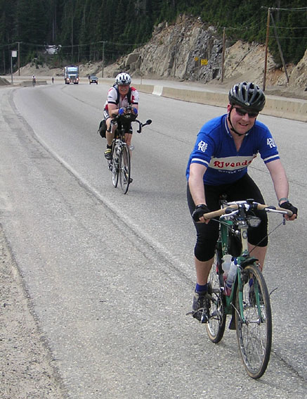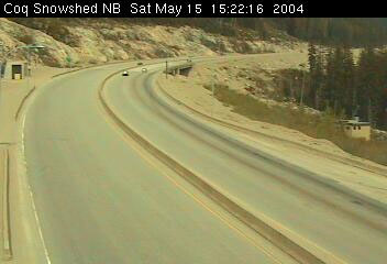 | While we were marching towards Coquihalla summit, Kevin (who, by the way, had pre-ridden this route a week earlier) was back in Vancouver voyeuring on the Ministry of Transport's Coquihalla snow shed web cam. Despite the 30 minute sample time Kevin did get results - les cyclists !!!. See the photo below... 10 points if you can spot the cyclists - 300 points if you can identify them. |