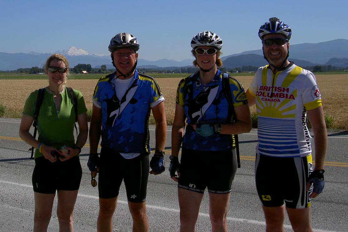 Karen, Brian, Amy and Peter at the Snow Goose Market control at ~90 km. Mt. Baker in background.