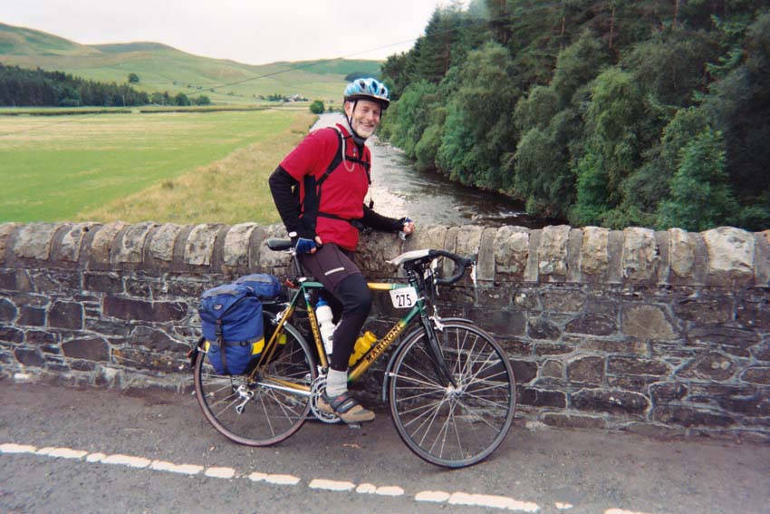 Wim at the Esk River bridge just north of Langholm (Km 800). Only 617 clicks to go.