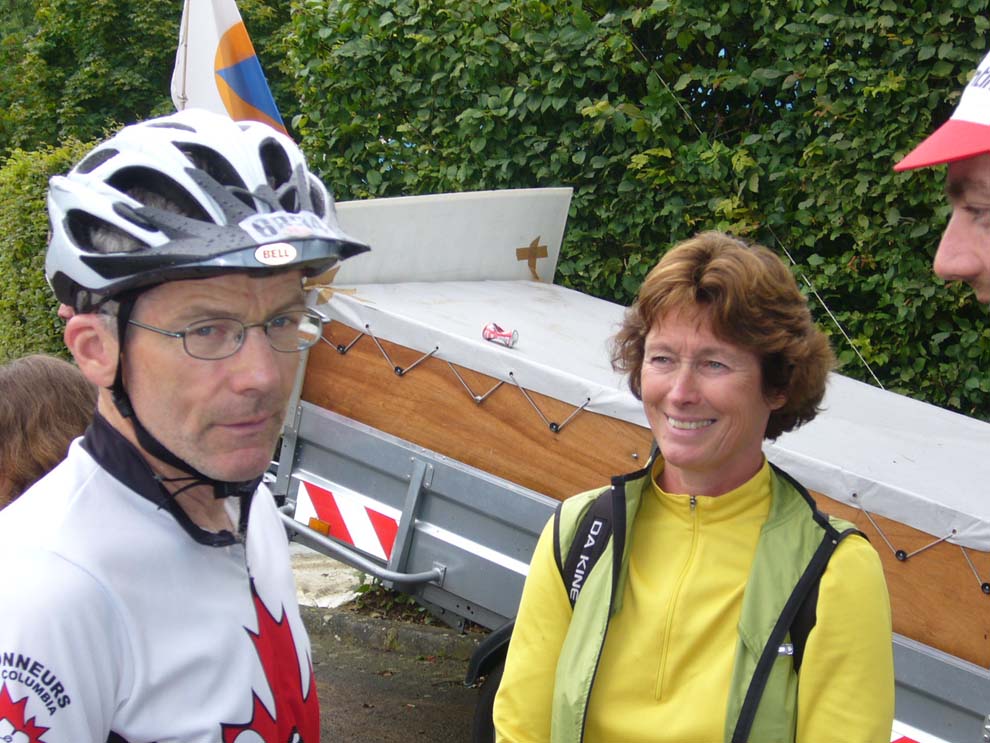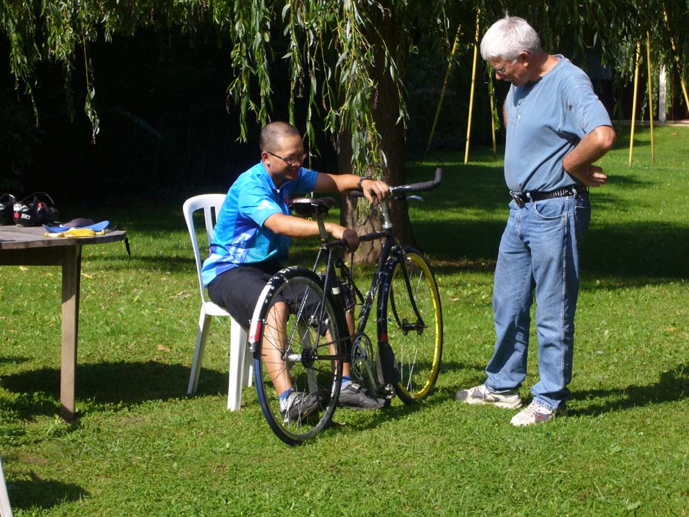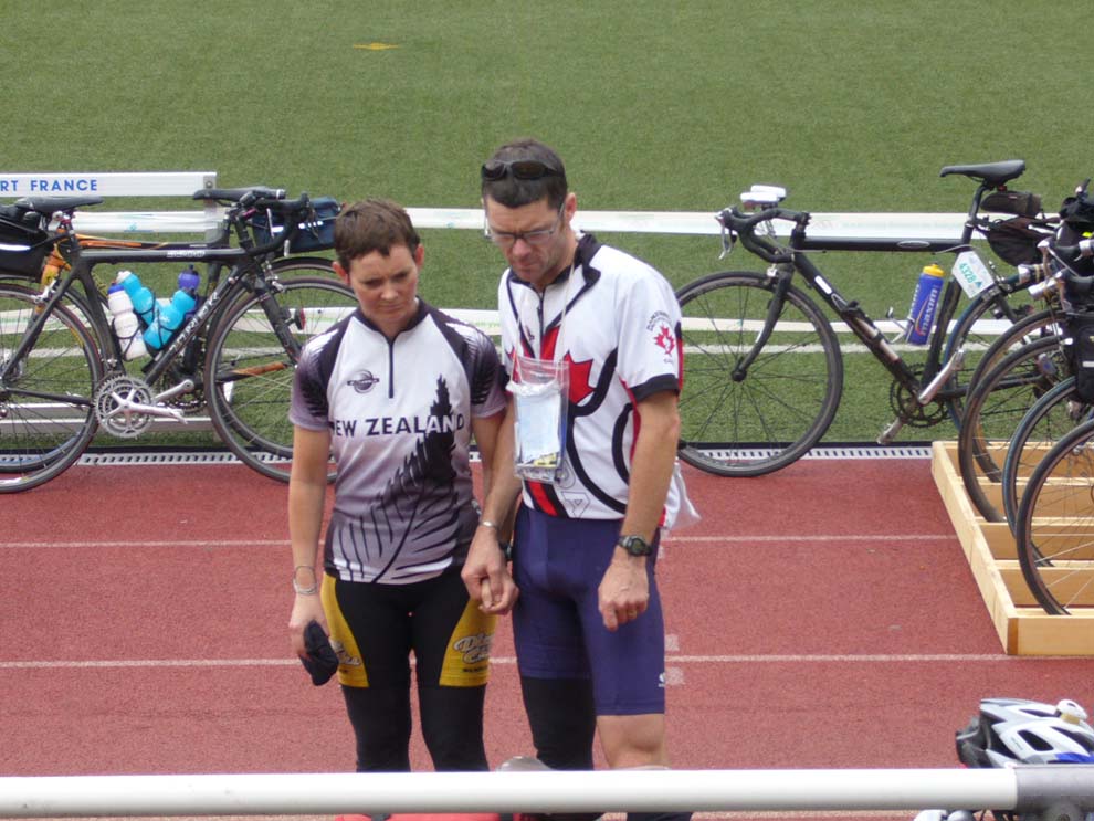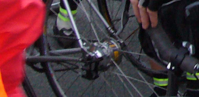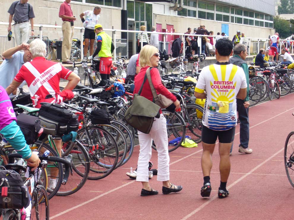 Tracy Barill in the start chute. Jeff would like you to "check out the rohloff hub on the bike in front of Tracy."