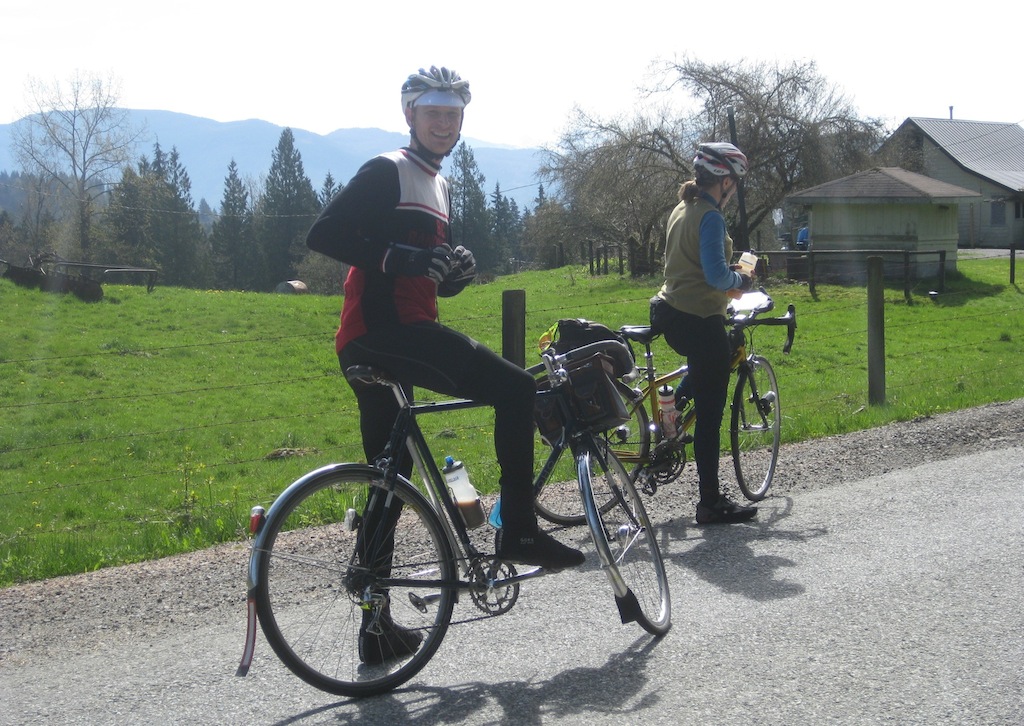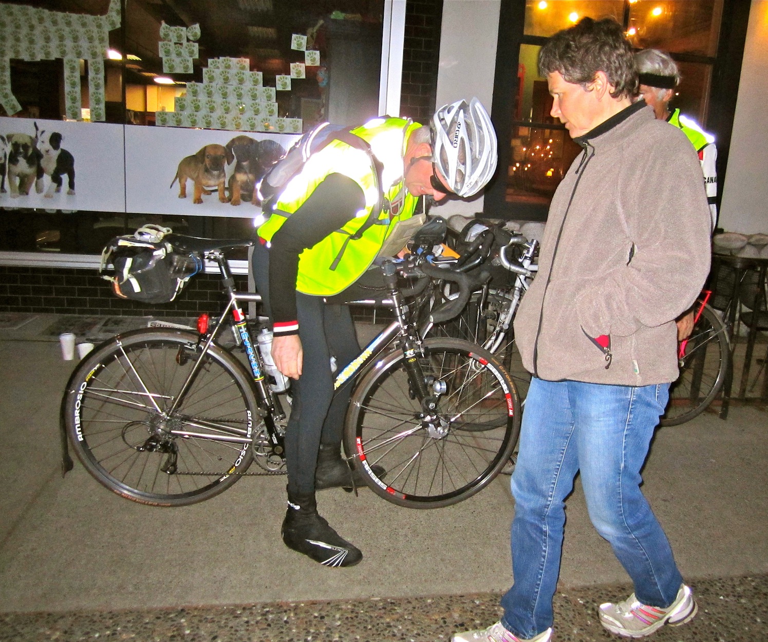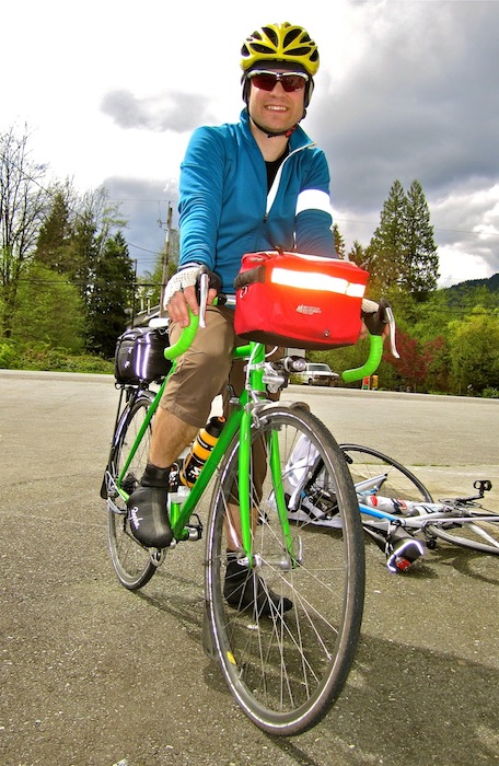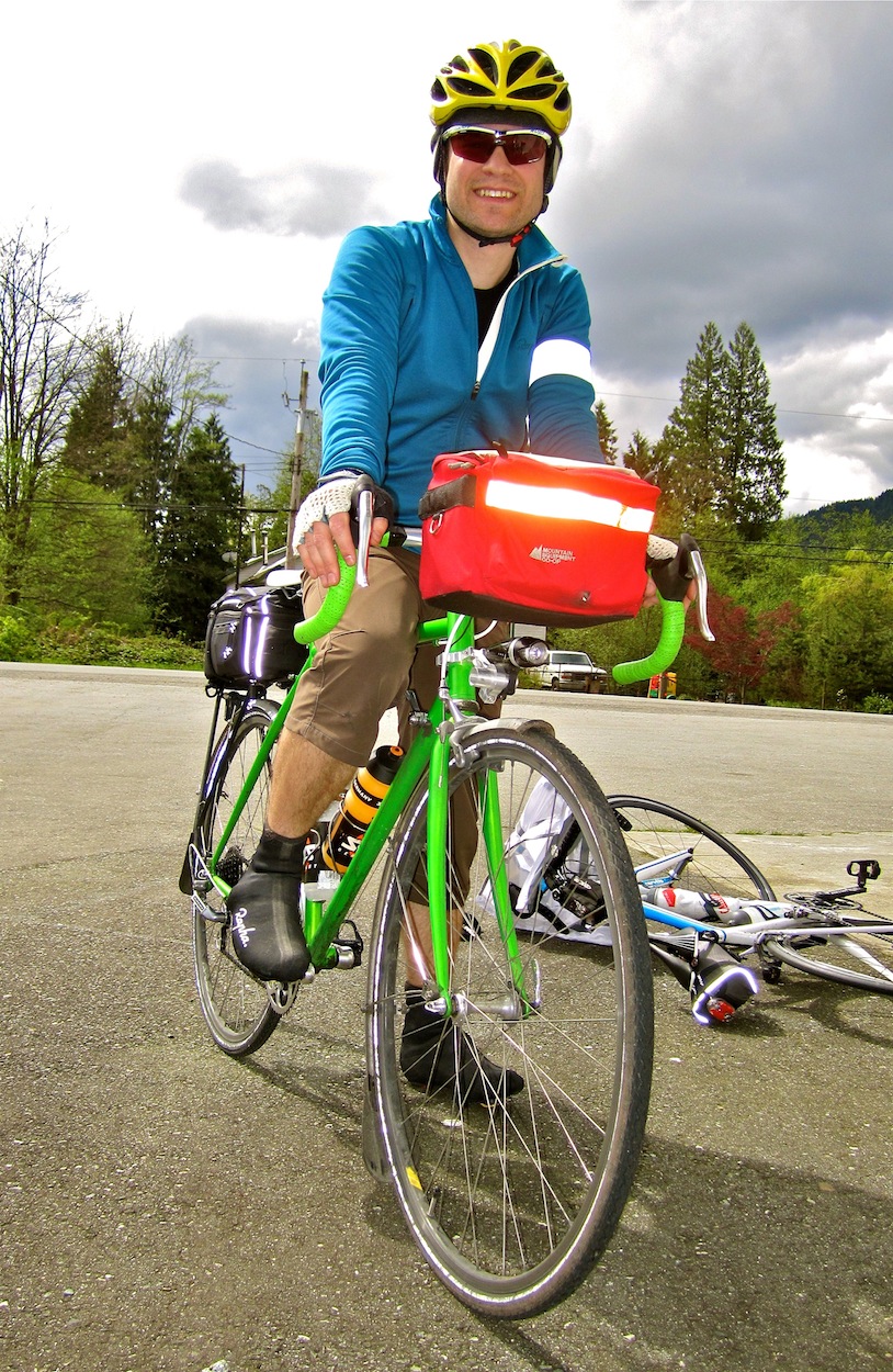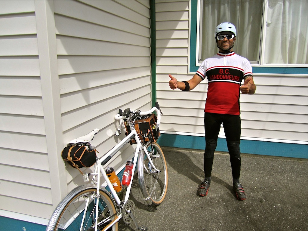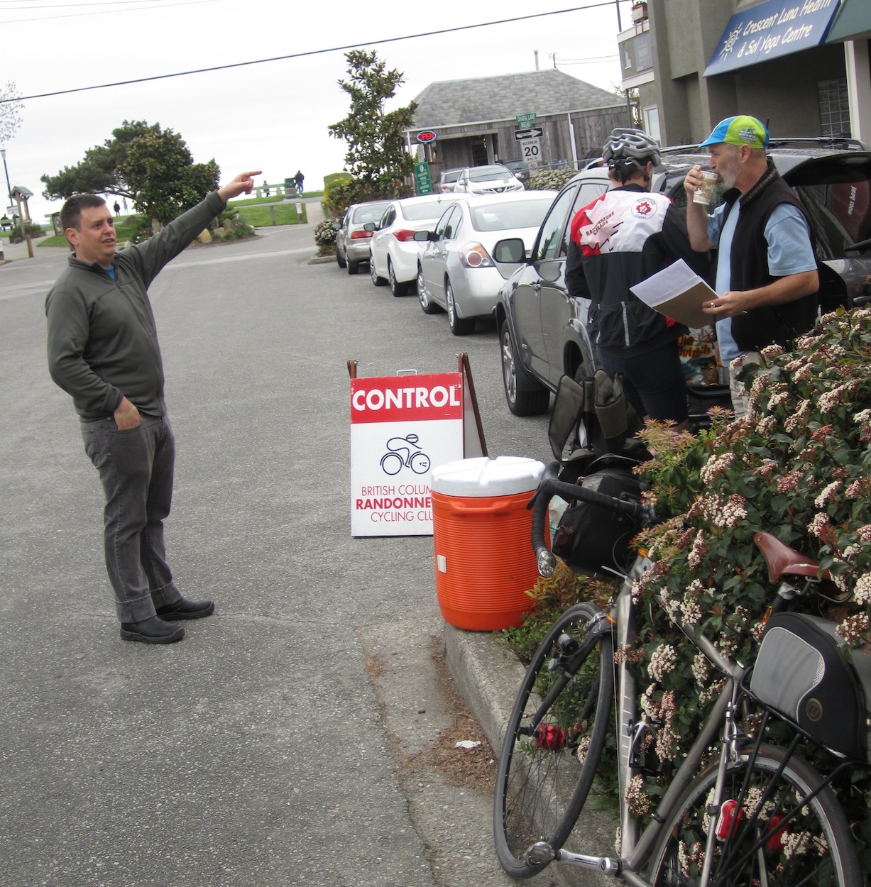 Notice that the organizer's kit fits neatly onto Chris' front rack. You don't need a car to organize a brevet !