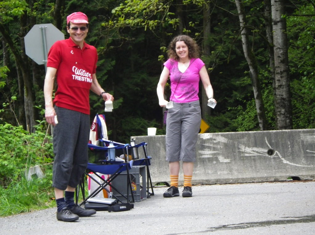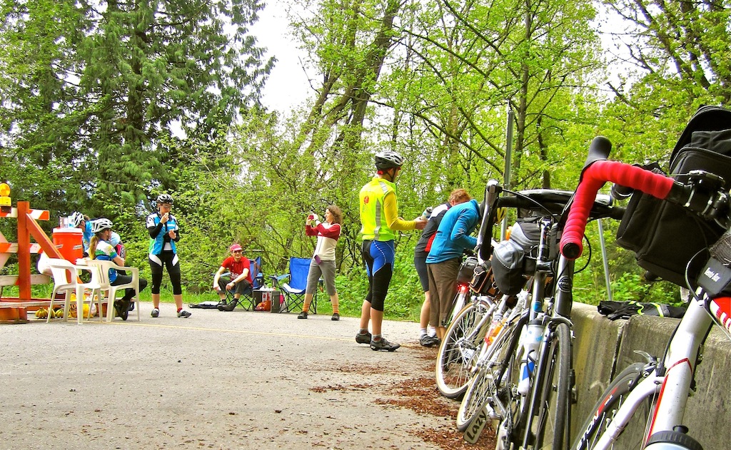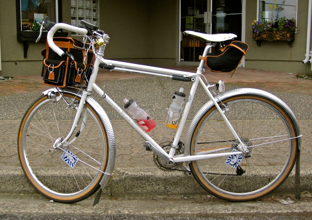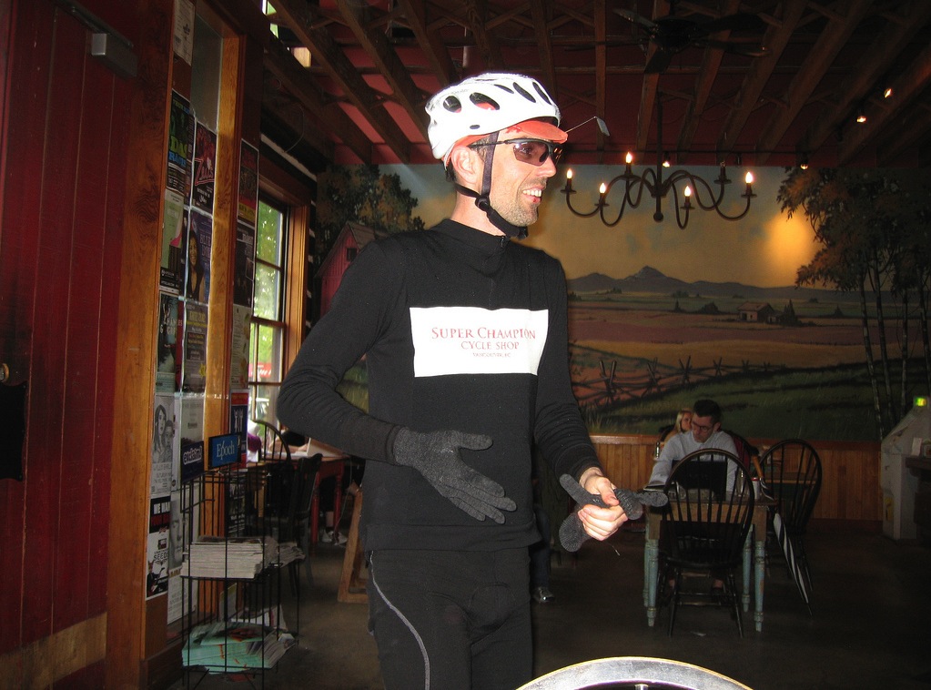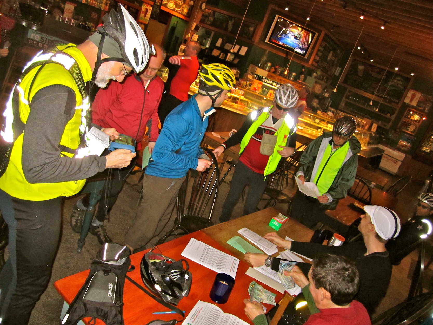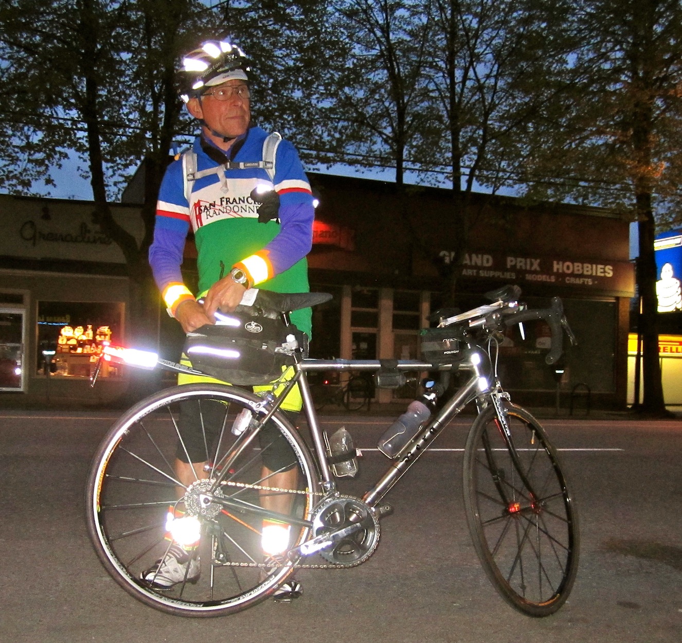 Notice that the organizer's kit fits neatly onto Chris' front rack. You don't need a car to organize a brevet !
