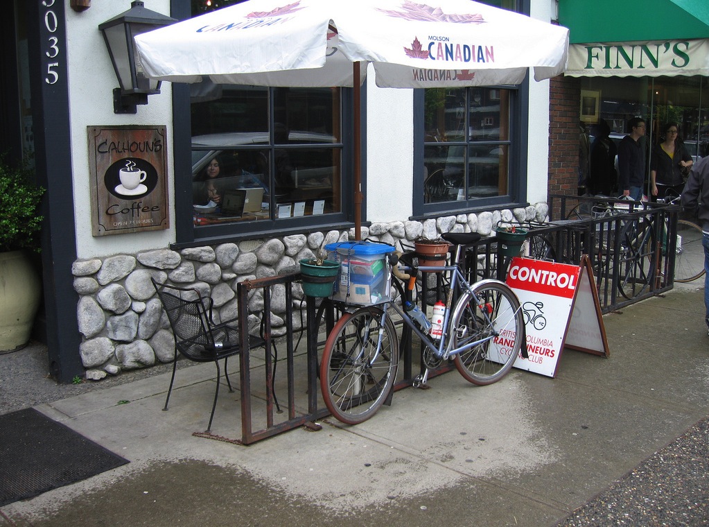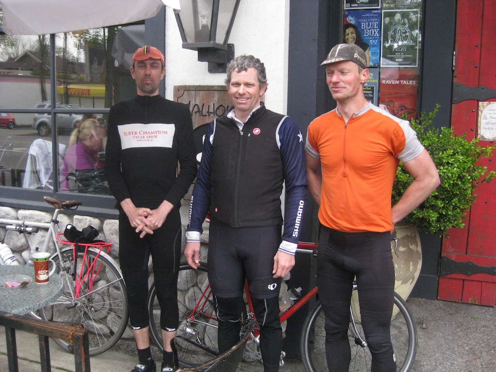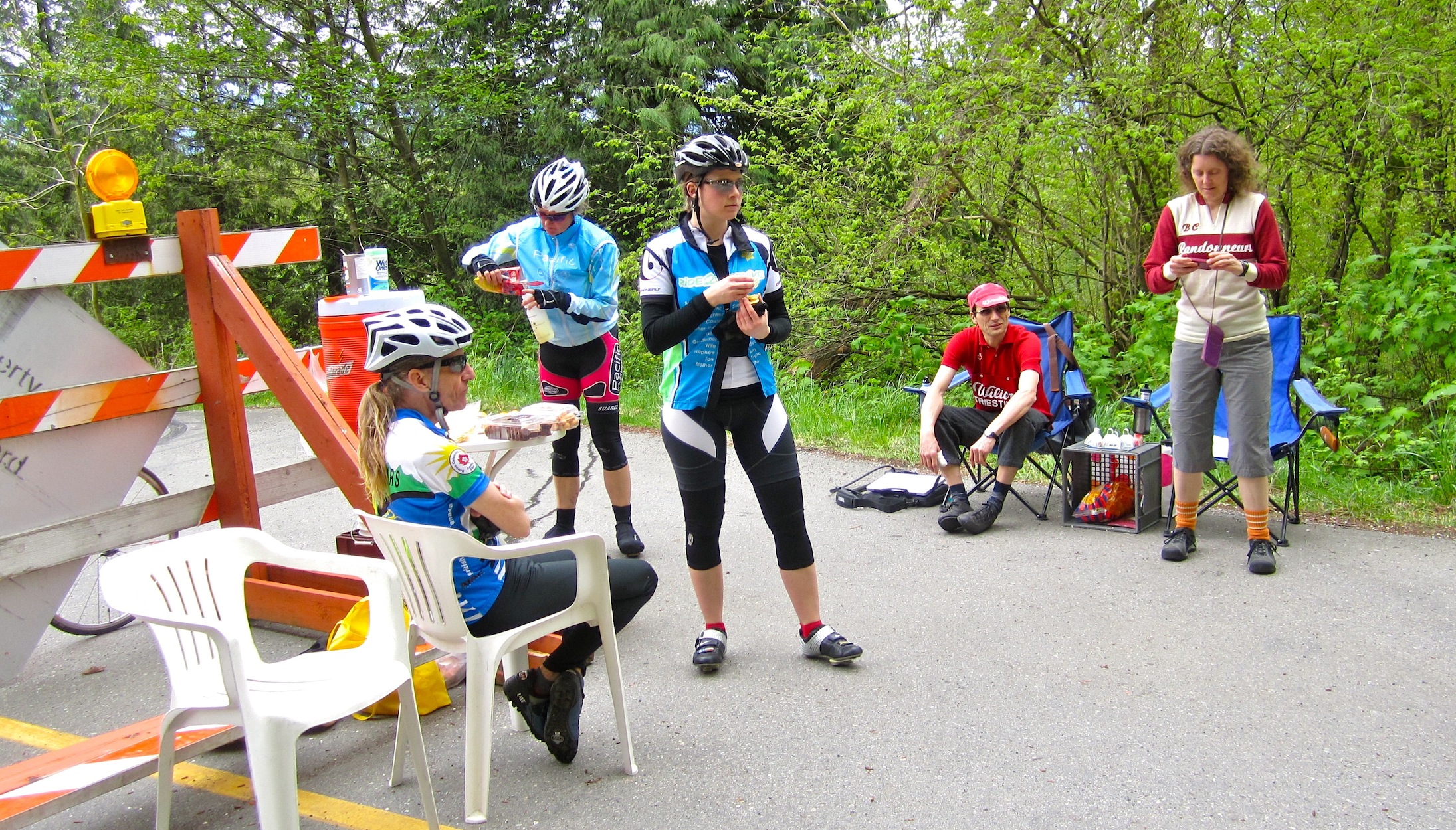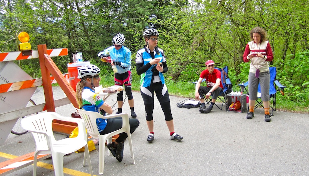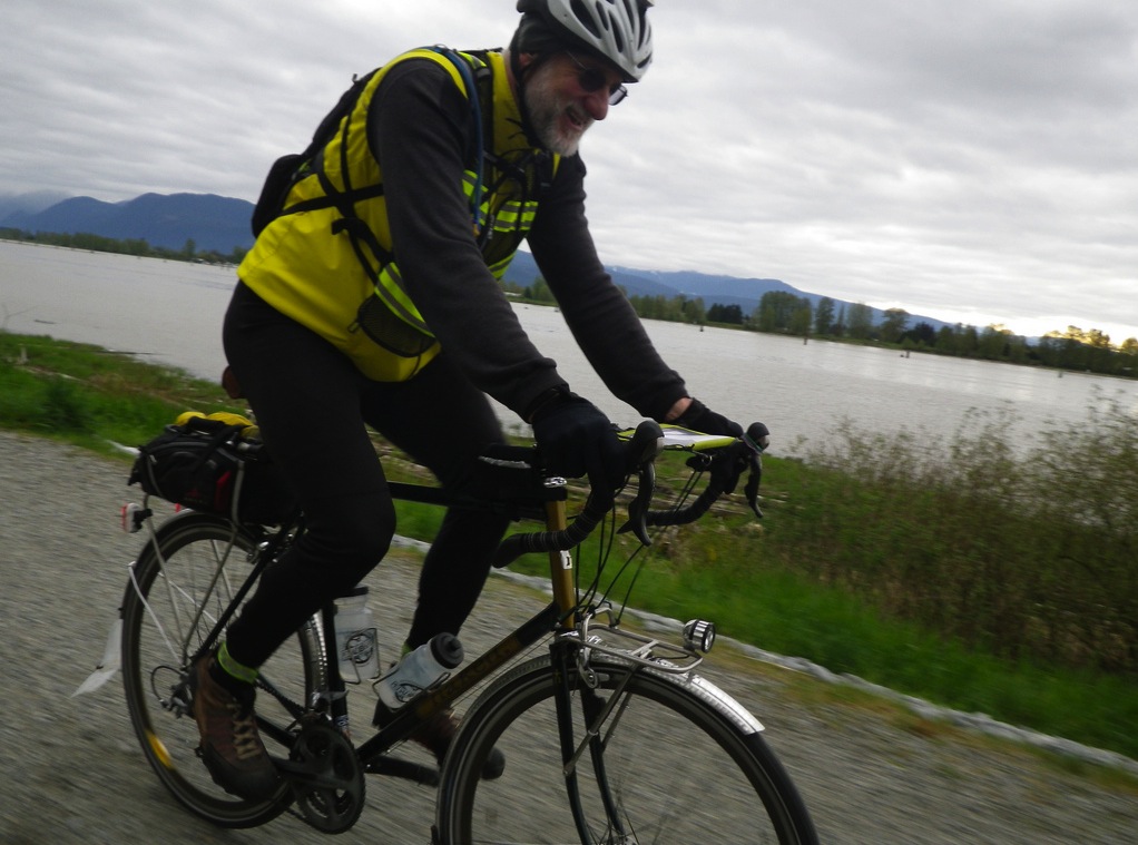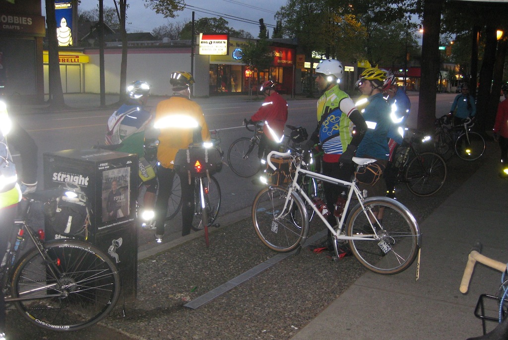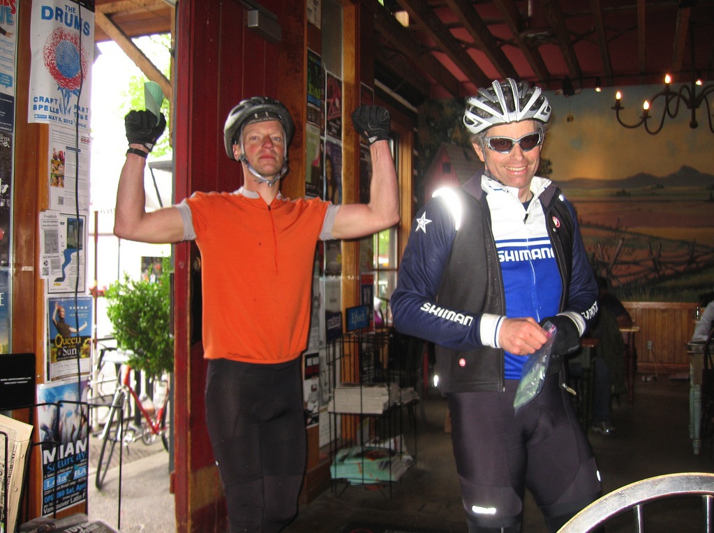 Notice that the organizer's kit fits neatly onto Chris' front rack. You don't need a car to organize a brevet !