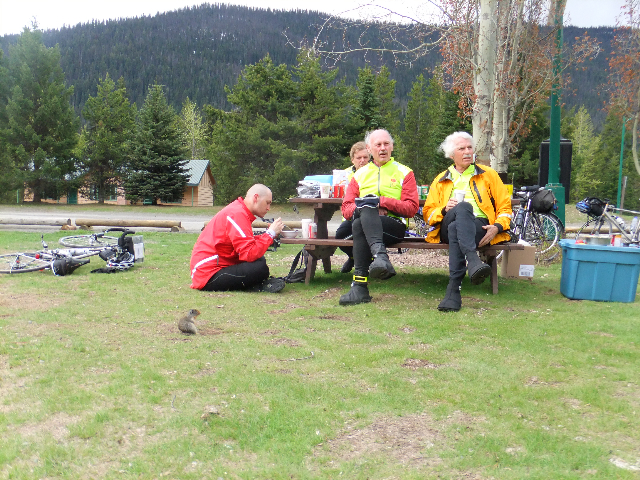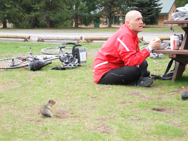 Dug Andrusiek enjoying his morning soup at Manning, under the watchful eye of a ground squirrel.
