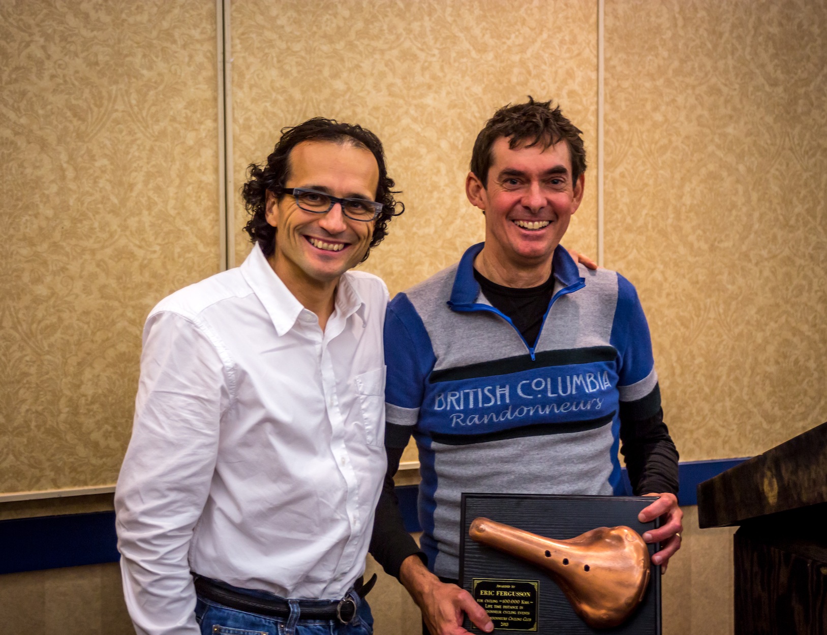 Volunteer and 1000 km brevet pins were handed out at the AGM. Here Michel Richard awards
