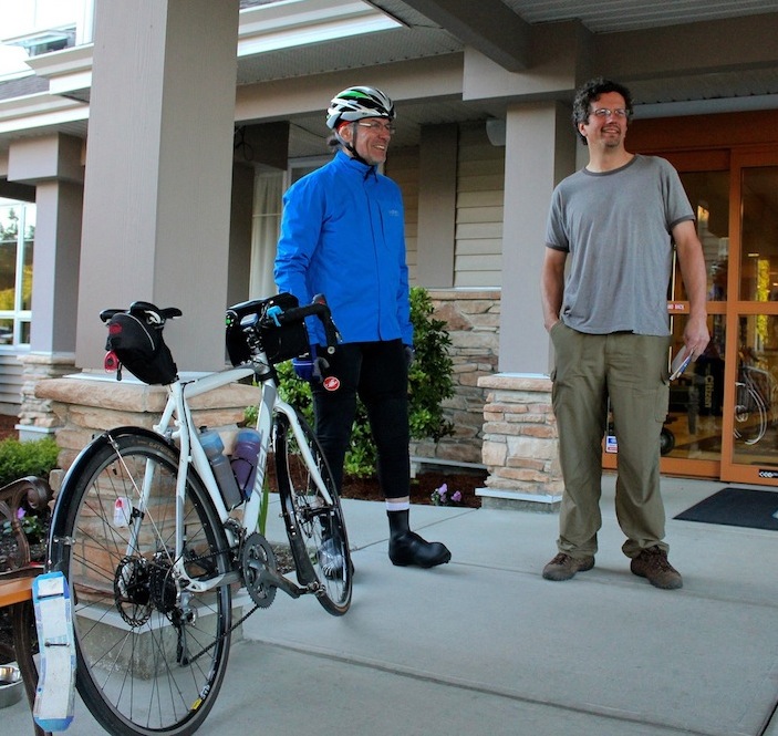 Eric Guillemot with ride organizer Steve Mahovlic at the Chemainus control on the Eau de Hell Week 400. Lost But Not Forgotten 400 km, May 23, 2013