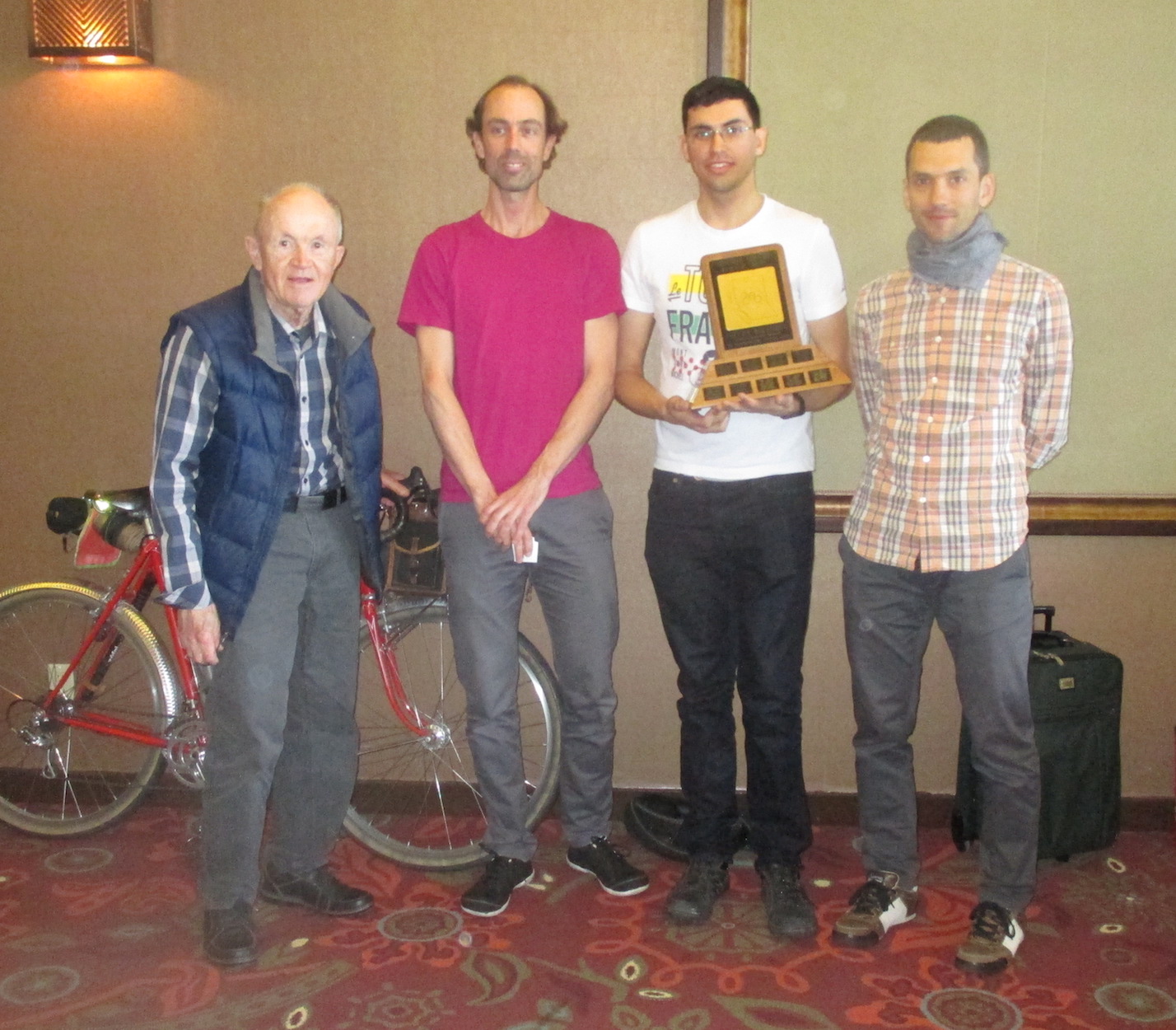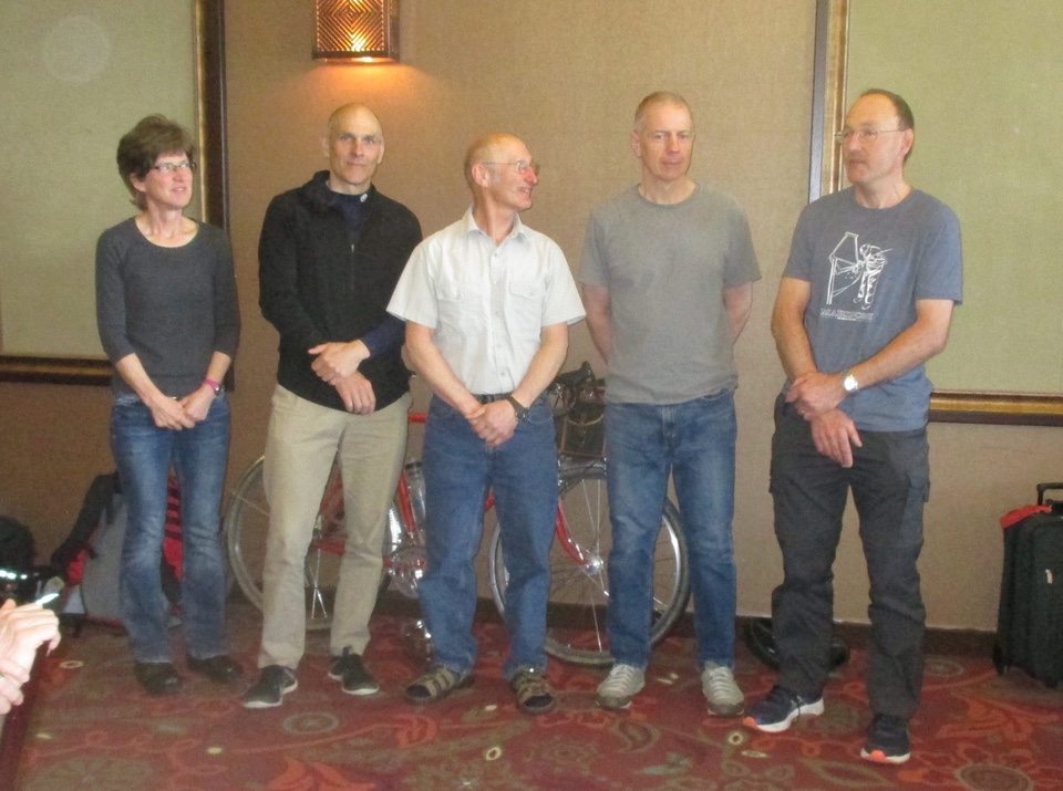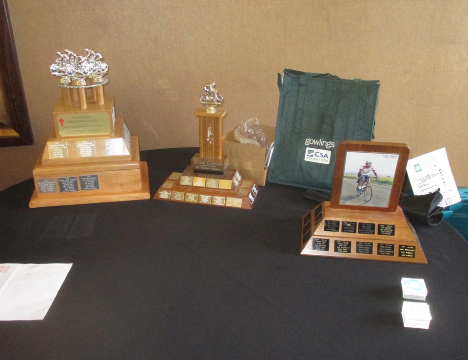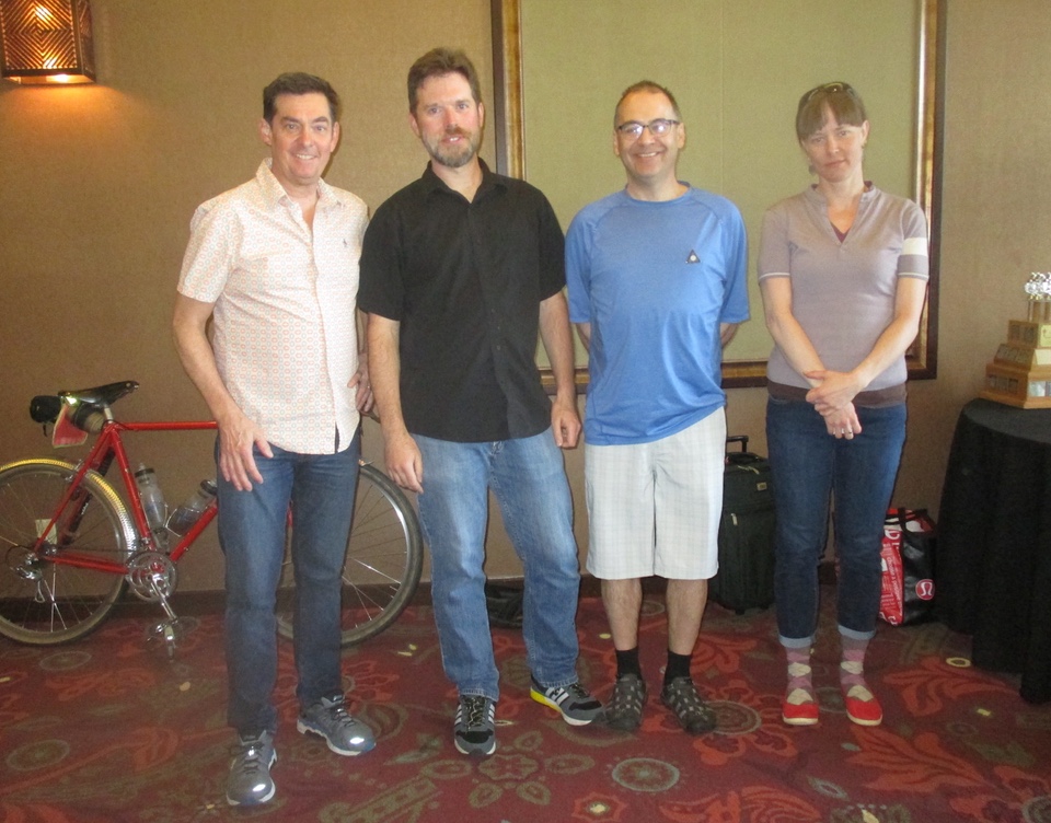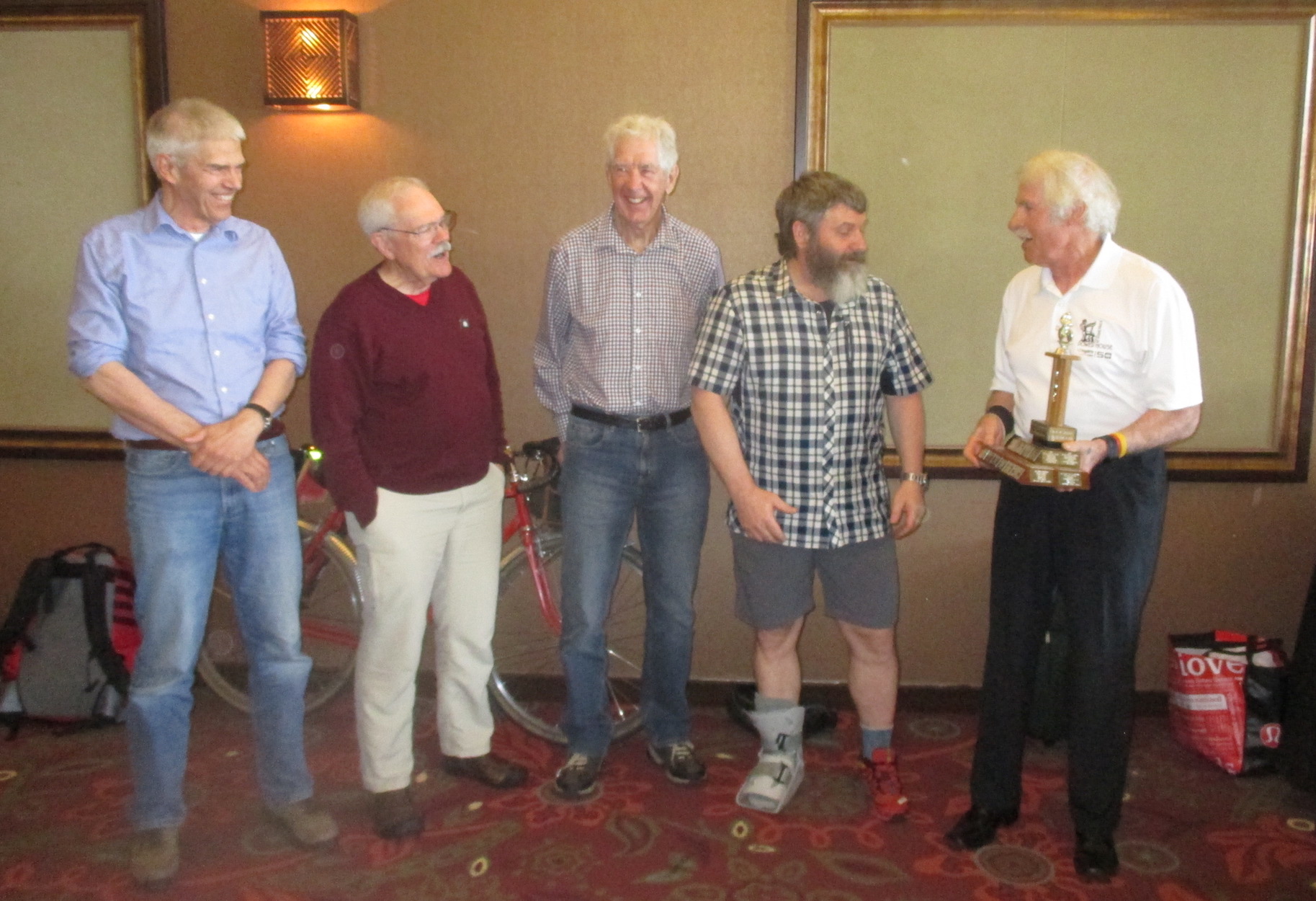 Presenter Dan McGuire with the Fashionably Late team receiving the Gord Bisero Trophy for most distance (514 km).