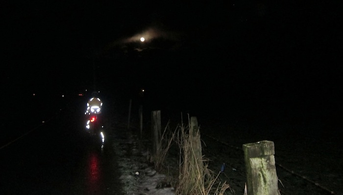 Karen Smith rides towards a full moon on a dark "Fraser Valley Flatlander", permanent #18. See photo Bigger December 29, 2012