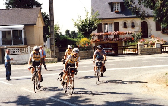 Coming into Tinteniac: Norm Brodie, Barb Lepsoe (in back), Deirdre Arscott and Michael Arscott. See photo Bigger Ride dates: August 26-30, 1991