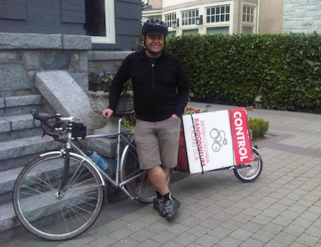Ben Coli was at the secret control on Misquito Lake Road. Here he is before ride picking up the control sign.