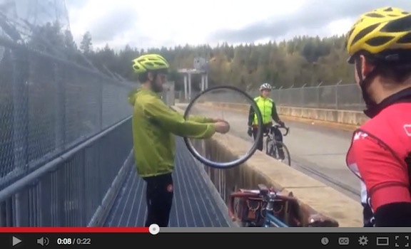 Lucus Gallagher preforming CPR on a wheel following another rider's crash on the Stave Lake dam. See Pete's Video (22 seconds)