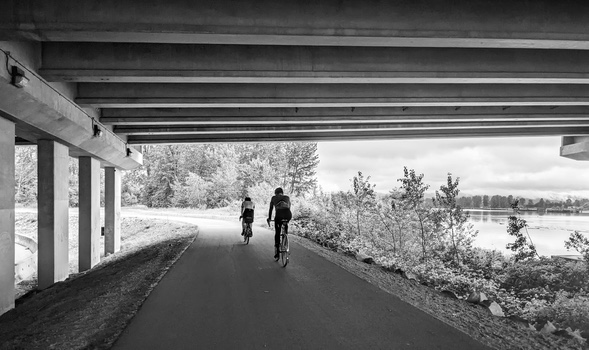 Riders passing under the Pitt River Bridge on the ACP Centenary 300.