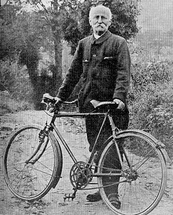 Velocio formulated the seven commandments for the cyclist: Velocio was not a promoter. His efforts to create a national bicycle touring society like the Cycle Touring Club in England floundered, and he never had an organized bicycle club even in his hometown. What he did have was a constantly growing body of friends and admirers who gathered around the master in his shop, at the rallies, and on his tours. Those who lived nearby formed a loose-knit group known as L'Ecole Stéphanoise, or School of Saint-Etienne. A quorum was always on hand for Velocio's favorite ride to the top of the Col du Grand Bois. It was this ride that eventually grew into Velocio Day. The Col du Grand Bois is a 3,800-foot passage across the Massif du Pilat. The road starts on the outskirts of Saint-Etienne and rises without letup over a distance of eight miles. Velocio used to make this ride as a constitutional before breakfast. In 1922 his friends surprised him by inviting all cyclists in the area to join in the ride in a gesture of reverence. Today, Velocio Day is a unique spectacle, the only one of its kind in the world. This gradual emergence of Velocio as a dominant figure, not only among cyclists but among the people of his age, is one of the most interesting things about the man because he never made a conscious attempt to attract public notice. All he wanted was his bicycle and his friends. He never moved his shop, he never had much money, and he never rested on his laurels. Twice a year, he would have a little notice in Le Cycliste, inviting all and sundry to a rally. These rallies became famous. At first strictly local affairs, they eventually became national institutions and some of them are still observed, such as the Easter gathering in Provence. Velocio himself was not aware of his stature until he was invited to appear in Paris in the Criterium des Vieilles Gloires when he was seventy-six. Then it was obvious that he completely over-shadowed all the others. Thousands gathered around him, just to shake his hand and wish him well. On February 27, 1930, Velocio started his day with a reading from one of the classics, as was his custom. It was a letter from Seneca to Lucilius. "Death follows me and life escapes me. When I go to sleep, I think that I may never awake. When I wake up, I think that I may never go to sleep. When I go out, I think that I may never come back. When I come back, I think that I may never go out again. Always, the interval between life and death is short." Velocio went out. Traffic was heavy, and he decided to walk and lead his bicycle. He crossed the street ahead of the streetcar coming from his left, saw another car coming from his right, stepped back, and was hit by the first. It was a mortal blow. He died clutching his beloved bicycle. Today, thirty-five years later, Velocio lives on, while others, equally dedicated and equally inventive, are forgotten. Why is this? It is because Velocio used his bicycle to demonstrate the great truths. Velocio's influence grew, not because of his exploits on the bicycle, but because he showed how these exploits will shape the character of a man. Velocio was a humanist. His philosophy came from the ancients who considered discipline the cardinal virtue. Discipline is of two kinds: physical and moral. Velocio used the physical discipline of the bicycle to lead him to moral discipline. Through the bicycle he was able to commune with the sun, the rain, the wind. For him, the bicycle was the expression of a personal philosophy. For him, the bicycle was the road to freedom, physical and spiritual. He gave up much, but he found more. Velocio--the cyclists of the world salute you. After typing out this article and preparing this page I discovered that someone else had beat me to it... This article can also be found on Adrian Hand's cycling pages -> Velocio. A new book on Velocio is scheduled for release in 2005 -> "Velocio: l'évolution du cycle et le cyclotourisme" by Raymond Henry. [EF]. June 2005 |