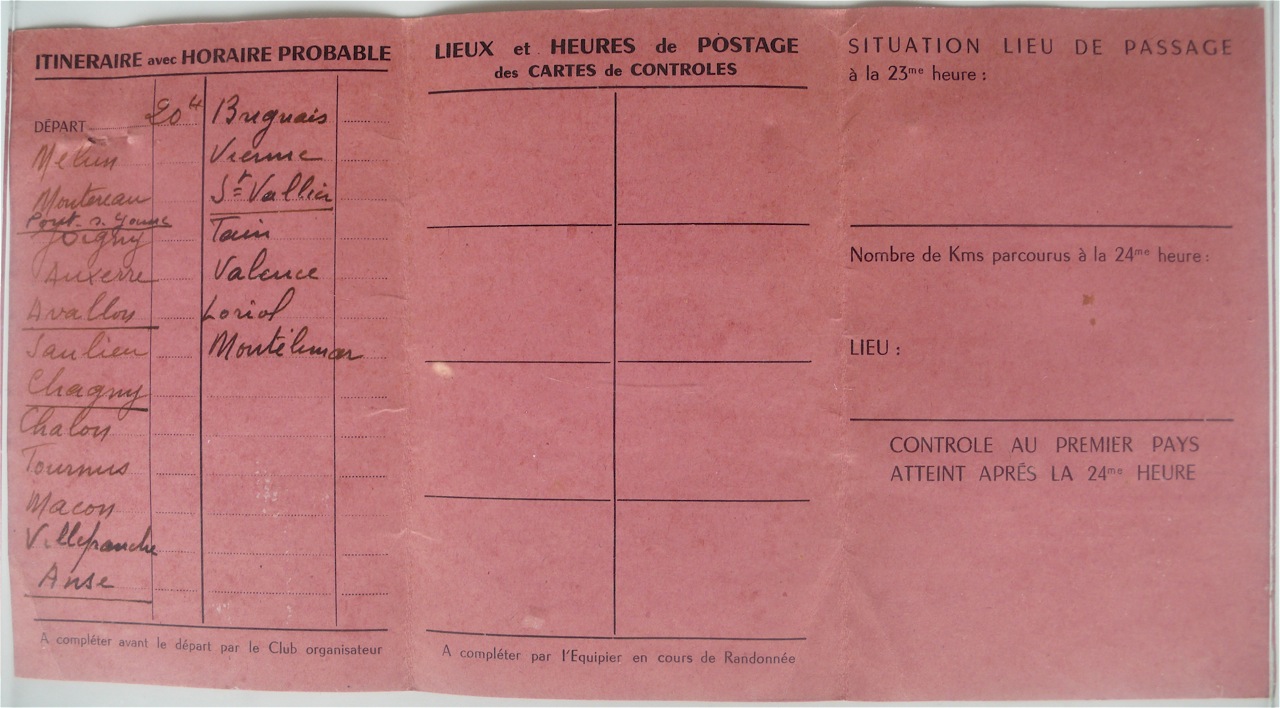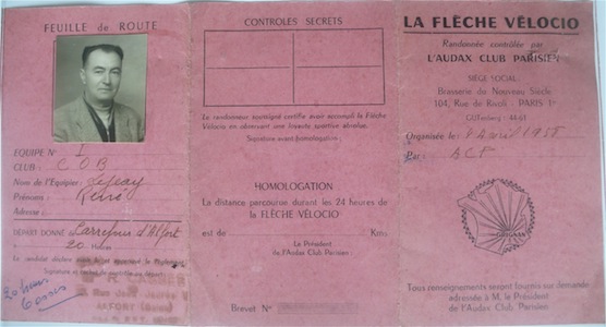 In 1967 (he was 65) he was probably retired, and lived on the Côte d'Azur. His last club was not the COB but the Audax Azuréens, a club in the city of Nice created in 1966. At the 16th April 1967 he homologated an Audax Brevet of 300 km. I have also asked Gilbert BULTE if he remembered Alfred LEGEAY. Yes, he was an excellent randonneur, not very fast but very long-suffering. His bike was a Herse. No idea about a possible wife, nor about his job. Sorry but it is all that I know about him."