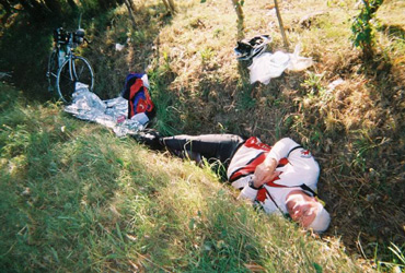 Paris Brest - The Last Ditch Effort We were lying in a ditch in rural France. Our bikes stood guard, upright, beside us. Our excess clothes, gloves, helmets, and the contents of our pockets were strewn on the grass, John was asleep. Hoards of bikers seemed to whiz by us on the road, in the direction of Paris. With 220 kilometers to go, we had given up. The heat of the day and the 1,005 kilometers we had already biked had won. We kept falling asleep on our bikes, and it seemed PBP had claimed another 2 victims. My husband and I were in France to ride the PBP. Everyone who makes it to the start line has endured challenges beyond imagining, in qualifying for this event. They are all winners. Especially those riding qualifying rides on the "Wet" coast. It is a crime when a rider does not finish this ride. So much time, effort, and money are expended. A voice in my head told me I was not well enough to start the ride. Seven days before leaving for France, I came down with a sore throat and a bad cough. The cough did not go away. I felt we had invested so much emotional, physical, and financial energy, that I was compelled to ride. The first night was scary. We started at 10 pm with 700 riders in our wave (out of a total of 4,069 riders) riding shoulder to shoulder into the dark. Even though I had ridden the 1,000 km distance, I had not tested my ability to endure sleeplessness. On the first night I kept wanting to lie down between 3 - 5 am, just before dawn. With the 10 pm start, the first sleep 90 hour riders might hope for is 24 hours after they begin. We arrived at the first control at 141 Km, 7 minutes ahead of our plan. We had been passed by many of the second and third wave riders who started later than us. I knew that I could not keep up the pace. I convinced John and our friend, Garry Elmitt, to slow down for the next 2 controls. It was hell. I was achy, weak, and felt flu-like, not to mention sleep deprived. Every control, I would tell John, "I'm dropping. I'll just have something to eat, and see how I feel, but I doubt it…" And on we would go to the next control, just to repeat the same scenario. Saint John was ever patient. There were a few reasons I kept going. On the first night we rode into the darkness of rural France, and could see only the shapes and shadows of the beautiful villas and treed hillsides and farms on our route. I knew if I dropped, I would miss all the scenery. Also the thought of the "sad, lonely train ride back to Paris" kept me going. I had dropped in a ride this summer, and the thought of the plane ride home as a DNFer was unbearable. As new Randos, Cheryl Lynch had vouched for our riding abilities, and even our character on more than one occasion; how could I DNF?. I could not add a 51 year old Canadian female to the DNF stats; everyone would think I was too old! Stupid reasons. I was too sick to ride. I knew it after the first night. Garry was riding too fast, for me; we had to let him go. I felt guilty as St. John was now forced to ride my snail's pace. Our first sleep was on a table in the cafeteria of the control at Loudeac. I tried to stretch out on the cafeteria floor, but too many bodies, and a spilled can of coke chased me to the table. John slept across from me with his arms folded on the table and his head on his arms. The alarm on my watch woke us. I sat up at the cafeteria table rubbed my sleepy eyes, as we had only had 15 minutes sleep. A couple of French cyclists were having breakfast beside us , at our table. I was wakened with the most cheerful "Bonjour, Madam". I just had to laugh. After possibly the best hot croissant ever baked, and coffee for breakfast, we tried to ride again. That was short lived. Fatigue was the ever-present demon. We kept trying to stop for power naps. Eventually we succumbed. I spread out my space blanket and John and I slept in a cattle field, at the top of a beautiful misty hillside, in the dawn light. And it was cold. We woke in an hour and our teeth were chattering. Again a rude shock to the system. It is very difficult to operate a bike when your body won't stop shaking. Oh, but it was pretty scenery. We literally lived on caffeine pills. Six or more a night, for four nights. It kept us going. The downside was that when an opportunity to sleep came, the pills made it impossible. Because I was sick and rode slowly, we used up all our sleep time and were constantly chasing a time deficit to make the closing times of the controls. On night 3 we rode with SIR members, Amy and Robin Pieper. Our caffeine pills helped them as well. The ride became a black road ahead, following lights up endless hills, and falling asleep on my bike. Thankfully I would wake up when I hit gravel on the side of the road. At one point I didn't know if John was in front or behind. Me, I was so out of it. Day 3 was hot. We slowed to a crawl after the sun got high in the sky. Falling asleep, and weaving, even a visit to a local café for some coffee did not help much. We found our ditch and had our 1 hour sleep. This is where I believe we had some "divine intervention". It was like I had been struck with a thunderbolt. I wanted to try to finish in time - so many riders were riding by our ditch, all hoping to make it, riding like bats out of hell. I wanted to go out in a blaze of glory, to finish, or explode in the process. I believe Roger Street and my friend Denise Mason had a lot to do with getting us going. They were watching over us. I was riding with Denise's bandana, she died of cancer in May. Roger had been our patron, and he always believed in us. I woke John up. He agreed to go for it. He said "stick on my butt". I did. This is what he had wanted to do for the entire ride. We passed so many riders saying, "This train's goin' to Paris, hop on!" And they tried. We rode with several people for a short time, but our pace was too fast. We were "on fire". So many hills, so few directional arrows….but we made it to the control. The spook