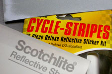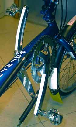 ![]() Note the reflective tape on the back of the mudgaurd too. The bike is a Rotator Pursuit long-wheelbase recumbent set up for randonneuring. Wear a dorky reflective vest. The vest will make you attractive to other randonneurs and it will make you visible to motorists. Make sure you don't get a cheap one with Chinese counterfeit reflective tape. The good (real) reflective tape is made by 3M, Reflexite and Avery. You can buy the 3M (reflective vest) tape at Outdoor Innovations on Main Street in Vancouver if you want to sew your own stuff.
