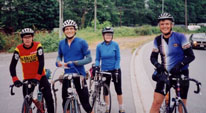 Apologies to Michel Richard who submitted this story to the newsletter one year ago only to have it lost in the shuffle. At the time Michel was President of the BC Randonneurs Cycling Club and for flèche pacifique 2004 he was captain of the team called "All the President's Men". Shame on You Mr. President It was under rather inauspicious skies that the rather hastily put together 'All The President's Men' gathered at Chapter's on the corner of Broadway and Granville for a 16:00 start. The team, made up of Susan Barr( I know, I know... ), Barry Chase, Eric Fergusson and I eagerly left on time and in good spirits for the 501.9 km route that was a variation of one of Eric's previous participations. Barry was nursing an Achilles problem that was the result of a sadistic 400 km ride the previous weekend that I had had the good fortune of preriding two weeks prior. It didn't seem to be hindering him though as he set the pace early on guiding us through Vancouver rush hour traffic towards our uncertain Fraser River crossing via the Patullo Bridge.