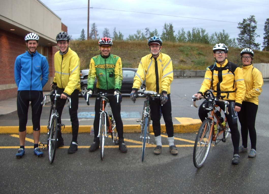 Harrison Ford's 'Hard' 200 km Brevet in the Interior The record shows 2005 as the 6th year running of this Interior 200 km Brevet. The route, originally designed, baptized and modified by John Bates and Danelle Laidlaw started at 100 Mile House. This was at one time a roadhouse or stopping place on the Old Cariboo Wagon Trail, which ran from Yale to Barkerville during the Cariboo Gold Rush. Always wondered how this Brevet got its name. Danelle explained that 'Harrison Ford 200' originated from a morning scene of loose horses in the parking lot at the start of the brevet at Mile 108 many years ago. Later on that day they encountered livestock on the road, which tested the bike handling skills of the urban riders on the range. This prompted name. Keith, Jack, Jeff, Wim, John & Danelle (Click to enlarge) Six riders (Danelle, John, Jack, Keith, Jeff and I) signed on at the 7:00 am start for the 'hard' route. Since it had rained the day before and the forecast called for 2- 4 mm of rain in the morning, no-one signed up for the 'soft' route (the one with 40 km of gravel). With a bit of rain, then clearing and a 10 kph NorthWester for the afternoon, we cycled east to the Interlakes site, Bridge Lake and Lac des Roches, our first control and also turnaround. As the names of these places and others later on suggest, this is lake country. The route would play more or less peekaboo with the many lakes; then we saw them, then we didn't, which not only creates the attraction, but also an element of surprise on this ride. The pavement was good, the road gently rolling and winding. Traffic was light and very few dogs were out, but none of the chasing kind. The one with those tendencies was 'thrown' a few conflicting messages - translation: I made a lot of noise, while Keith or Jeff told the critter to get of the couch. That confused and slowed him substantially. As we continued the clouds thickened and after Interlakes, they wrung themselves out, which meant rain. Not too much, except that it was the cold stuff. We were told that someone would be around at Control #1: Lac des Roches (Km 60) to sign our cards. Upon arrival however the site was deserted, however a cleaning bucket near an open cabin door was enough evidence to call inside for someone to sign. It then became clear that this someone was a guest. Ah well. The next leg went from Lac des Roches along Highway 24 to Control # 2: Lone Butte (Km 104). Saw a neat geological formation, evidence of the time that BC gained a few chunks of crustal material. On that stretch we also met quite a few cyclists (many on recumbents) going east to Little Fort on what looked like a supported bike tour. Looking west the skies kept teasing us with a bit of blue in the distance, but that's all they did: tease us. We stopped briefly at the General Store in Lone Butte (half way mark), got our cards signed and supplies restocked. While the rain had tapered off, Lone Butte became a memorable landmark for two of us, for it was here that 'Julie saved Keith', potentially the location and title for a Western movie yet to be scripted and filmed. Nearly chilled to the bone, Keith got some dry, warm clothing, and then happily continued. It actually gave him wings, because he arrived well ahead of us at Control # 3: Green Lake (Km 147). If that stuff isn't material for a blockbuster movie! Since the resort at Green Lake had already removed its sign, we deemed a telephone booth along the road the makeshift control. Julie kindly signed our cards. The route from Lone Butte to Green Lake was very scenic, rolling and winding with many a good view of the lake. The wind appeared to help a bit. Livestock was grazing on the range; luckily, a huge but docile bull in the berm showed no sign of wanting to chase us. Good choice. We would have been too fast. From Green Lake its was a mere stone throw to 70 Mile House, except that the NW winds were in our face. After the control 4: 70 Mile House General Store (Km 161) we had 42 km to go North. The fun would start, because the forecast 10 kph NW wind turned into a 26 kph one with gusts up to 39 kph. Talk about blowing your forecast. Add the tough uphill to Begbie Summit (1237 m), and you'll appreciate the challenge. To reduce the wind resistance, Jeff, Keith and I rode single file. From the summit onward the road leveled off, except for the last six km to the finish. That downhill section provided for a space shuttle descent into the finish at 100 Mile House (Km 202). What a great way to end this brevet. This brevet is a really neat one at the end the season. The route is easy in terms of riding and navigation. Mentally and physically it can be divided in many small bites. The profile consists of slightly rolling hills, none of which are very onerous, except maybe Begbie Summit. At the end of the season we all should be in good enough shape to make this one of the more leisurely brevets. The scenery is rather appealing: forested areas, open spaces, grass- and parklands, and above all lakes. The only thing missing, I'd say were the vivid fall colours of the aspen. They were in progress, but we were just a bit too early, I guess. One of the fun challenges is cycling across the many cattle-guards after Lone Butte. Jeff and I made a bit of game of it by trying to ride on the narrow flat strips, thereby avoiding the washboard effect. The batting average was not quite 1.00. Finally, my appreciation to John and Danelle for designing and organizing this brevet. Thanks to everyone for making this a memorable experience.