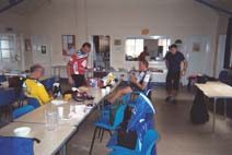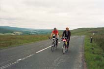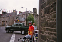 The stop here was brief, because we wanted to capture as much daylight as possible. The coffee, soup and other goodies did miracles. After we resumed, our speed increased substantially. We turned on to a narrow lane with several 'sheep guards' (cattleguards for sheep), which had to be crossed carefully. We conquered quite a few long climbs. It must have been past 11:00 pm, when we arrived at Innerleithen, still another 50 km to the turnaround. We had to clarify the route directions with local residents. They warned us about sheep on the road ahead. I couldn't help but remark that if we'd collide, it would be a soft and woolly landing, later on realizing that most sheep had been shorn - thus no soft landing!! For a moment I also wondered why in the land of plenty there was no mutton and red wine on the menu at the controls. Then again, come to think of it, we could have easily dropped in at a restaurant for such a gourmet dinner. Never thought of doing this. We were too occupied. Ah well, next time. After some 30 km in the Moorfoot Hills we came to a snow-gate. The route sheet read to go through, but the sign blocking the road indicated construction ahead and pointed to a detour. Lacking local knowledge about the state of the road and the nature of construction - who wants to possibly cycle 10+ km of gravel in the dark? So we decided to follow the official detour through Heriot. The detour added an extra 10 km to the 1,417 km brevet. Less than 1%, so what? We rapidly descended the dark and winding road; caution was the word and deed. We finally made it to the A7, which led us through Edinburgh's suburbs to Control # 10: Dalkeith (Km 707). Arrived at about 1:30 am Monday morning. Time for a shower, a meal and a sleep. The hot shower was great, so was the meal; what counted for 'sleep' left lots to be desired. The post had run out of cots and blankets, so the solution: find a spot and fend for yourself. It was not very warm. I found a spot, used a tiny towel as blanket. That did not work, so I put my Goretex jacket on, closed up every vent and zipper to keep the heat in, only to discover that this material has absolutely no R-value. I shivered and teeth-chattered myself through the rest of the night. Was I ever glad to get up for a hot breakfast. Day 3: Monday July 25: Dalkeith - Eppleby (247 km)