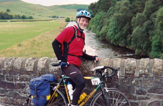 'Woke- up' a little after 5:00 am. Many riders had already left, so the hall was less crowded. Breakfast went down a lot better than the food upon arrival. The morning was stunningly beautiful, very serene and peaceful. It felt great to get on the road again through this pastoral landscape with lots of sheep. First we tackled some pretty steep rollers, much steeper than expected. There were heaps in the berm; these had us guessing as to their origin, cause and purpose. No, they weren't road markers, anthills or disintegrating sandstone rocks. What could they be? So after a bit of scientific and non-scientific deduction, I figured/speculated/concluded that they must have been heaps of sand mixed with road salt to help motorist in the winter safely tackle the slippery slopes. We could have asked, I guess. The climb through Coxwold was challenging, but scenically rather rewarding. Soon we were in more open country on our way to Control # 7: Eppleby (Km 461). At that point we had covered about one third of the distance. We did not stay very long, then moved on toward the Pennine Chain, Britain's geological spine. This leg was quite pretty; we crossed the Tees River a few times and noted an increasing amount of road kill. The further North we went, the worse it got. The road was littered with dead rabbits, crows, magpies, hawks, rats, partridges, all kinds of rodents as well as hedgehogs, all unsuspecting victims of encounters with travelers of the other kind. We avoided the spiny leftovers of hedgehogs, because no-one was interested in multiple punctures. Many of the rabbits were totally flattened and dried-up, leaving no more than a thin sheet of 'bunny paper' on the asphalt. In our (my) sillier moments, I suggested they'd make fine souvenirs: 'From Scotland with Love.' Plain silliness of course, but that sometimes happens on long rides. The road kill however did remind me of an interview broadcast many years ago on CBC radio 'As It Happens', with a peculiar Brit and his extraordinary habit. The latter made him peculiar. I can't recall whether he traveled by car or motorcycle, but his habit was to scoop-up road kill, clean it, wrap in foil and place it on the manifold. He then kept on driving until it was done. The well-done, rare, medium or scorched morsels then became the carnivorous component of his supper. He recounted many tasteful, and less appetizing details of the raw status of the road kill as he picked it up - I'll spare the details. Pheasant was the only kill he wouldn't put on the manifold. This bounty he'd take home, string it up and let it cure until the head fell off. Only then would it be ready for the pot -- after further necessary culinary treatment of course - and eating. So the story went. While there was ample road kill between London and Edinburgh (and back) to feed all of us, none of us made use of it. No manifold on the bike! We passed the beautiful Barnhard Castle and gradually climbed our way up the spine toward Control # 7a: Langdon Beck (Km 503). Here they served yummy potato-and-leek soup, good coffee, sandwiches and fruit. Langdon Beck isn't much more than the youth hostel, a few distant and dispersed farms; a pub and a church, at least judging by the name St. John's Chapel. The countryside looked like one gigantic alpine meadow. Windswept grasslands with miles and miles of stone fences. It felt empty, remote and austere, yet the scattered farms in the valleys below, somewhat protected from the elements, and the sheep on the hillsides provided ample evidence to the contrary. There were stunning views, although somewhat subdued by the overcast skies that day. Wondered what a bright sunny day would do to this open space. Departing from Langdon Beck we headed for the summit at Yad Moss over a persistent 11 km climb, then descended over the next 15 km to Alston. There was a brutal 16% drop in the last 400 meters over a cobblestone road surface, including a 90 degree left turn as conclusion. We stopped briefly at optional Control # 8: Alston (Km 530), another youth hostel and then continued. Turned right at the war memorial and went up the hill on a section, which for a change required little route sheet reading for the next 28.8 km! Time to take the eyes of the odometer and enjoy the pretty scenery and rolling landscape. The winds had died, the cloudy skies opened and sunshine 'broke out'; temperatures rose. After Brampton the choice between a 'hilly route over back country lanes' or the 'heavily trafficked A6071/Longtown/A7 to Cannonbie' one. We opted for the latter, which on account of Sunday turned out to be a rather quiet route. Outside Longtown the winds picked up, to bother us until Control # 9: Cannonbie (Km 588). That control provided good food and offered a service with a personal touch. For a pound we'd buy a Cannonbie postcard and the control crew would mail it. Since the leg from Cannonbie to Dalkeith was 119 km, LEL organizers had set up an extra control after 53 km at Boston Hall near Ettrick. This would then leave another 66