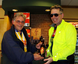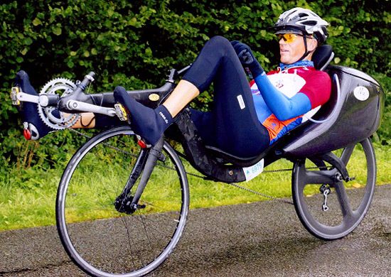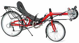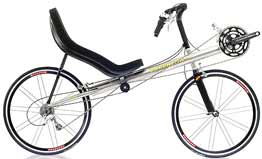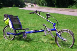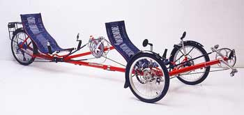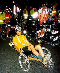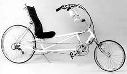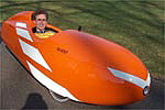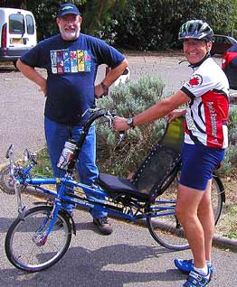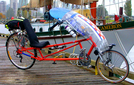 That's my lightened-up Easy Racer Gold Rush with a carbon fiber seat, carbon fiber fork and carbon fiber water bottle racks conveniently located right on the handlebars! It's an excellent climber due to the stiff frame and direct drive-side chainline (no idler). ![]() Dave C. on right - proud recipient of the "Eau de Roses" prize at the 2008 Eau de Hell Week on Vancouver Island. (Pictured with series organizer Ken Bonner.) [Here's the original article from Feb 2006]: ![]() A Prairie Randonneur and his Lightning recumbent at the 2003 PBP. Photo: Ted Quade. That's a Lightning P-38 (around $3000), an American historical standard of speedy short-wheelbase recumbents. Several P-38's have done PBP. The P-38 is relatively unique in that it has a type of space-frame. These days there are a lot more recumbents being manufactured and the P-38 would be considered a low-production model for the connoisseur. There is a carbon fiber version of the P-38 that weighs 19 pounds (called a Lightning R84, for around $6000). At the 1999 PBP Bob Fourney rode a faired version of the R84 (called the F90, which costs about $15,000) to 14th place overall in 47 hours and 17 minutes. Mind you, that excellent time may have had something to do with the cyclist and not just the bike. Bob did win the Race Across America 3 times. Why Ride a Recumbent? After the 1999 PBP I was looking at the results sheet and I noticed that a man on a tricycle had finished PBP in 69 hours and 17 minutes. What!!?? Most people would be lucky to go that fast on their fancy 20 pound racing bike, for crying out loud! Was that trike guy superhuman or something? How did he do that? I asked the trike guy. His name is Ian Humphries. Ian owns a bike shop in Australia called Flying Furniture Cycles. I asked him why on earth he took a trike to PBP when he could have taken any bike. Trikes are heavier than bikes and trikes have an extra wheel to haul around. Ian explained that the trike was actually very suitable for PBP. The trike has a very comfortable recumbent seat. The trike is also faster than it looks. It's very low to the ground and the seating position is more aerodynamic than an upright bicycle (ie it has a lower coefficient of drag). As an added bonus, trikes don't tip over when you stop - that can be a handy feature when you are zombified and sleep deprived during the latter stages of PBP. Trikes are also more fun than a barrel of monkeys. ![]() Ian Humphries on his Greenspeed trike at the 1999 PBP. Photo courtesy of OzHPV. http://www.ozhpv.org.au/index.htm Greenspeed makes several models of single trikes as well as a very interesting tandem trike. ![]() The Greenspeed tandem (about $8000). http://www.greenspeed.com.au/ For more info on recumbent tandems see: http://talu.com/ Anyway, that recumbent trike of Ian's got me thinking about riding a recumbent bicycle in the PBP. I know, some of you are thinking recumbents are dark and sinister and possibly subversive. I know a couple of you are even thinking up another tired recumbent joke (or should I say "redundant" joke, ha, ha, ha, har-dee, har, har). Some of you may even be thinking that riding a recumbent in the PBP might be tantamount to committing cultural heresy in France. Well actually, no. Recumbents were invented in France. In the early 1930's recumbents were being manufactured in France by Frenchman Charles Mochet. By 1933 a Mochet recumbent had broken the hour record at the Parc des Princes Velodrome in Paris. Recumbents ARE French culture. Plenty of recumbents have done PBP. In fact, the only thing that prevents recumbents from being used in the Tour de France are the arcane rules of the UCI. Otherwise, all professional cyclists would be riding recumbents. Recumbents can go faster. That's why the UCI banned them on April 1, 1934. However, there are no such professional cycling rules preventing you from using a recumbent in the PBP. The 2003 PBP The fastest recumbent bike in the 2003 PBP was a... well, uh, it wasn't really a bike as we know it. It was Theo Homan on a Thijs rowing bike (62:29). That is just too wild, even for me. The second fastest recumbent was Ben Sherratt on a Challenge Jester (65:25). The Jester is a lowracer designed for track racing. It's so low it's really impractical for anything else. The Jester chainline is right next to the front wheel so you have to be careful not to turn too sharply or you'll derail the chain. ![]() Challenge Jester http://www.challengebikes.com/index.php 2 minutes after the Jester arrived back in Paris, Hans Wessels pedalled into the finish area after a refreshing randonnée to Brest. Hans deserves special mention because he made it from Paris to Brest in 27 hours and had adequate time for a good night's sleep in Brest. Hans also carried 20 pounds of snacks, two spare tyres and enough batteries for a blackout in a small village. Even more remarkable was the 70 pound vehicle that Hans used for the PBP: ![]() Quest Velomobile http://www.velomobiel.nl/ The three-wheel Quest velomobile (about $8000) that Hans rode is not even a bike - it's a velomobile! The Quest has a comfortable recumbent seat and room inside for a week's shopping. The Quest slips through the air with ease but I thought it would be way too heavy for PBP. Obviously I was wrong. Hans had this sage advice: "Stop worrying about bike weights and so on. Most important aspect of a PBP bike is it being comfortable. You will ride on it for a long, long time. Your daily commute bike might be a very good PBP bike. You ride a lot on it, it is dependable and you know the bike by heart." 'Bent Shopping Tips ![]() The 20 pound M5 TiCa lowracer designed by Bram Moens (no price yet, it's a new model). It's bead-blasted titanium and carbon fiber frame is causing multiple orgasms amongst speed-crazy recumbenteers. http://www.m5-ligfietsen.com/main.php ![]() The lovely and curvaceous VK2 semi-lowracer. http://www.velokraft.com/ The 20 lb VK2 (about $4000) from Velokraft is another recumbent