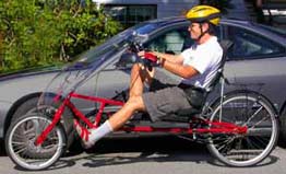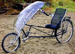 and i'm sure many others are up there close to these but my recent Carbent experience makes me think the stiffness of the bike and lightweight makes a decided difference...direct power transfer. The (Bacchetta/Vyatek) Carbon Aero is not currently in production but all the other bikes in Sloji's list are available at the time of this writing. What I'm Using For Brevets These Days I'm currently going against the popular wisdom by using a long-wheelbase 'bent for brevets. Convention would dictate a comfortable laid-back (short-wheelbase) highracer, midracer or lowracer for randonneuring but I am a long-wheelbase type of guy. I love the high-speed downhill handling of an Easy Racer and I like having my feet down low for riding in urban traffic (stops and starts are easier with a low bottom bracket). I also like using a fairing in cold and wet weather and Easy Racers are perfect for fairings. In fact, you need a fairing to make an Easy Racer go fast. The laid-back short-wheelbase 'bents don't need fairings. I use a Zzipper Lexan fairing but Easy Racers sells a fancy ultralight carbon fiber fairing that also blocks the sun.