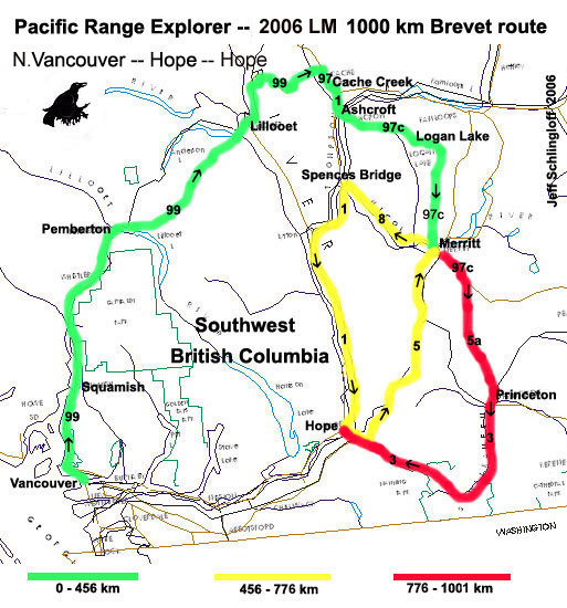 Pacific Range Explorer 1000 There were two 1000 km route offerings for the August 2006 long weekend (5th-8th). Though there was interest shown for Stephen Hinde's CCC 1000 (Cariboo Clockwise from Clearbrook), in the end no one attempted it. Jeff Schlingloff did ride the other 1000 - a route he designed based on the Switchback 1000, but with the easy Fraser Valley parts snipped out. I thought the route was just insane enough to rate a mention in the newsletter. Following the map find Jeff's notes on his ride. At the bottom on the page is a link to Jeffs own extensive pages about this route - be sure to visit this site.