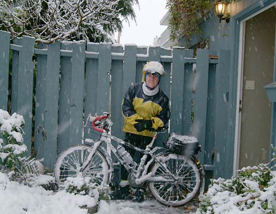 The rain had just turned to sleet, as I left the house at 9a.m., and the inclination to spend half-an-hour switching from one inch Conti Gran Prix tyres to two inch knobbies, on my trusty Rocky Mountain Blizzard, was overruled in favour of getting on the road before the snow accumulated. Wouldn't you know it, as I punched into wind-whipped ice crystals (highly-rimed dendrites, I believe) out in Hunt Valley, the bike seemed even more sluggish than a couple of inches of snow might cause. I had, it appeared, sustained the first flat tyre of the year! Could I make it to Mitchel's Farm, a couple of kilometres on? There, a large awning extends from the front of the market, which would at least give me a modicum of shelter from the driving snow. This was not going to be fun, though; my fingertips were already numb, in spite of neoprene gloves. It didn't take long for the proprietor to see me pulling off my ice-caked wheel. Seeing me using my cell phone, he figured I was calling for someone to rescue me. I was simply letting my wife know that I was having a jolly good time. "It's just like cross-country skiing . . . on wheels," I enthused. "Yes, dear," Amanda sympathized. "Don't forget the brevet organizers' meeting is at two." "Come inside," the kind farmer insisted. "Can I bring my cruddy wheel in?" I asked sheepishly. No problem. Next thing I knew, I had a steaming mug of coffee and paper towels to dry the wheel off. Never did find what caused the flat - no staples, thorns or glass. The rim tape was as good as the day I installed it. With trepidation, I put in a new tube, thanked my gracious hosts, and pointed my Blizzard into the storm. A news van was parked on the side of Pat Bay Highway, filming vehicles performing drunken Ice Capades. I stayed on Lochside Trail, until Mount Newton Cross, continuing on Lochside Drive, until my odometer said I could beat a retreat, with the wind and horizontal snow-flakes at my back. Coming back over the exposed flats (just this side of the hog farm, for those of you who know Saanich) I had begun to resemble an alpine larch, having built up a rather substantial layer of rime on my north side. I also discovered, upon stopping at Mattick's Farm for a nature break, why my neck was getting tired: I had gathered about six inches of snow/ice on my noggin. When I looked in the mirror, I laughed; I looked like an ill-sculpted Frosty the Randoman! In fact, as I neared Victoria, the whole ensemble - bike and rider - had come to resemble some kind of badly-executed plaster-of-Paris Christmas ornament. Bad enough to scatter small children and make dogs bark on the final kilometres of the Galloping Goose Trail. It was here that I took the only spill of the day, when I lost track of the track in the white-out conditions. Luckily, I got up unbent. The most difficult mechanicals turned out to be the tendency of the chain to hop when attempts were made to change gears, due to the fact that the rear cogset had assumed the appearance and consistency of a frozen meteorite (Note: single-speeds for winter riding) and the fact that, every time I put my foot down, my cleats attracted an inch of ice. Well, I'm off to do that belated tyre switch. How long do the meteorologists predict this weather will last? Is it worth investing in a pair of expensive studded tyres? Ho, ho, ho, Randoray Ray's website: VeloWeb -- A Cyclist's Diary