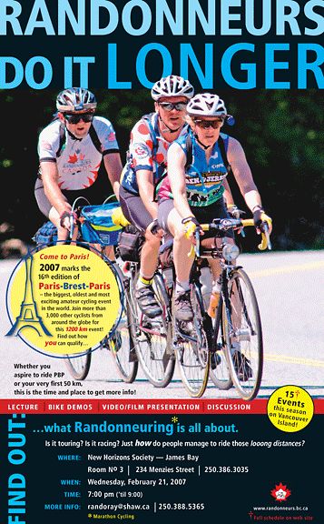 Vancouver Island PBP Info night Here are the details for the up-coming PBP info night. And check out the promotional poster. [ed: Looks great Ray!] Raymond Parker Info night program: 1. Introduction: Randonneuring & Paris-Brest-Paris - Ray Parker