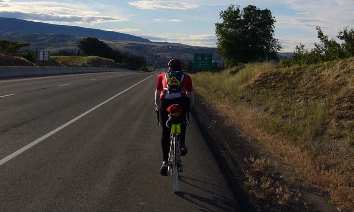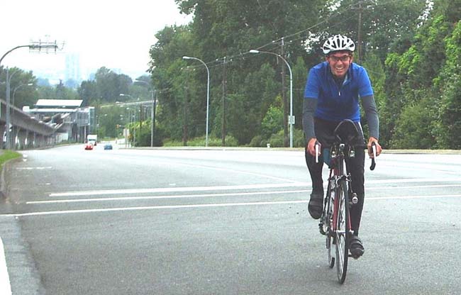 6 a.m start group - Manfred, Jeff, Ross, Nigel, Keith, Sigi, Gary (Unknown photographer - photo provided by Jeff Mudrakoff) Mountains & Deserts Here's a synopsis of the 2007 Lower Mainland June 1000. It was a modified version of Wayne Harrington's Mountains & Deserts 1000 km route from 2003. Nine riders, two start times: (6:00 AM START) (8:00 AM START) Right off the start Gary crashed. He carried on to the Huntington/Sumas border crossing (75 km) before callingit a day. The 8 am start was less eventful, but... I couldn't believe my eyes a few km into the ride - John, Danelle, and Sharon were at the top of the Sperling hill cheering enthusiastically. They had been there for the 6 am starters also. Still smiling. Me at 4 km. Photo John Bates It wasn't looking good for Sigi when I saw him at the side of the road just past Sedro (145 km). He had had a couple of flats, and was now looking at two broken spokes - both rear wheel, drive side. Still no word from Sigi. I'm assuming alive but DNF. [This just in... Sigi managed to have a repair done in Burlington, but had already lost a lot of time. He continued through severe conditions to Skykomish, where he abandoned.] I arrived in Skykomish (284km), the last town before the climb to Stevens Pass, cold and soaked after riding the last 10km in heavy rain. There had been a bit of rain earlier in the day, but this was different. In the Chevron a west bound motorist asked about the cyclists he had seen on the road to the pass. "Pretty rough conditions up top" he observed. Those crazy maniacs, I thought. It was now past 9:30 and I wasn't sure it would have been smart for me to do this at night. Alex had arrived earlier and was thinking the same thing. We found a motel room to wait out the storm, or at least the darkness. We later wondered if 6 am would have been the wiser start time. Back on the road at 4 am., we were still facing rain, more like drizzle, but lightening skys. The descent was, of course, icy cold, but probably better for me and Alex than for last night's crew. Later I learned from Nigel that heavy rain hit him on this descent, and it was no doubt just as bad for the four other 6 am starters. (Their plan was to meet up with Keith's wife Julie and drop bags in Leavenworth (366 km)). Alex was clearly not up his usual strength - probably a lingering virus - and after the descent, he called it a day. Nevertheless he pressed on an additional ~125 km to Chelan (453 km) before rendezvousing with Barb and kids. Manfred - near Wenatchee ~ 395 km Photo: Jeff Mudrakoff The 6.5 hours off the road in Skykomish would mean that I would spend the rest of the ride playing chicken with the time limit. I made it to Chelan before the cut off, but then hit worsening head winds and then terrible loose surface chipseal roads after Pateros/Brewster. Mercifully the winds weakened before sundown, but I was still dancing with the time limit and couldn't risk sleeping in Osoyoos. No choice - I pressed on through the night to Princeton. This turned out to be the toughest stretch. After Richter (682 m) I faced severe head winds. By Keremeos there were gusts so strong I was barely moving at all. I learned later that the conditions through here were just as bad for everyone else. The wind, she is a fickle creature... the week before on the Kamloops/Okanagan 600 we were going the opposite direction, and also facing headwinds (though not like these). I arrived at Princeton at 6 am, finally comfortably ahead of the time limit, but slept long enough there to ensure that I would again be chasing the time limit to Hope. I learned later that Gary was back on the route, now in his car, and watching out for the remaining 6 riders. He found Manfred on the road to Keremeos (Manfred slept in Osoyoos), but was a little concerned when he didn't find me - we must have missed each other when I was recharging in Princeton. After the usual battle with elevation and head winds through Manning, I arrived in Hope... once in Hope, you're home free. It was a beautiful starry night, with crescent moon, and no wind - an easy ride home to the Knight & Day. When I arrived, Jeff was just leaving (he had stayed for a meal). He got me caught up on the others. Keith, Ross, Manfred and Jeff had all come in together, and not too much earlier. It made me wish I hadn't spent so much time eating in Hope and Mission. We might have all come in together. Except Nigel... I got a call from Nigel the next morning. He had ridden straight through. Despite the same killer head winds in Keremeos and elsewhere he finished in 47:01, over 20 hours before the rest of us. Photo: Jeff Mudrakoff