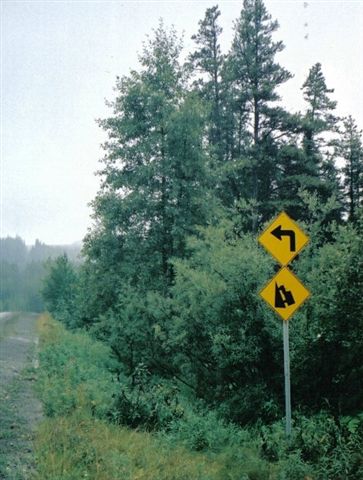 Now what? What to make of this one? You may shake your head and wonder (a) which side your brain is on; (b) which road you're on; ©) whether the laws of gravity gave been changed? (d) whether your have lost it all; or (e) all of the above? Then you realize that in randonneuring everything is possible and nothing impossible. Keep on cycling and enjoy the quirks of the road. Note: Sign 5 was posted on a road just south of Tumbler Ridge, B.C. October 27, 2007 |