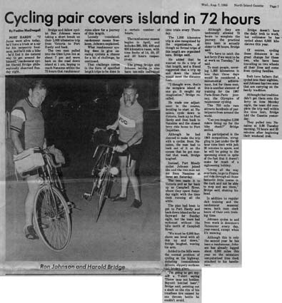 Here's a blast from the past. Rando pioneers Harold Bridge and Ron Johnson were the first riders to face the Island End to End 1000 km route. And they got some press. You'll find the full sized (readable) version of this article in the press archive section originally assembled by Wim Kok . This article arrived in the mail today from Harold. Click the article to go to the archive page. [EF]