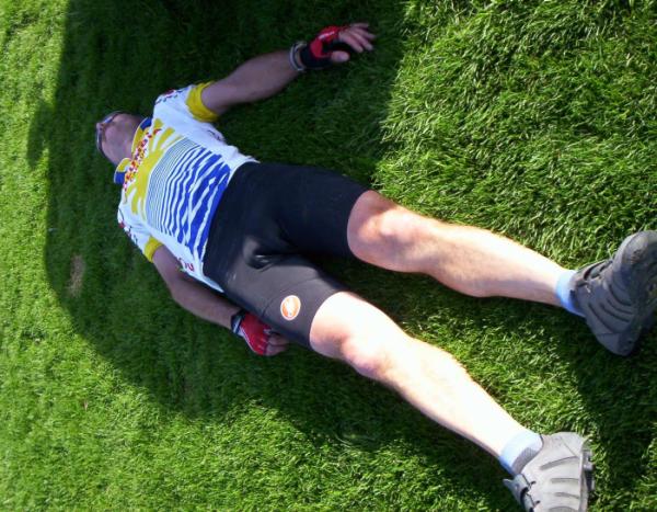 Interior 300 The morning of the Interior 300 started out perfectly. Fifteen riders headed out in clear skies, calm winds and cool temperatures, though we knew we were in for the first hot day of the year. I started out cycling with the Supermen- Ian Fillinger and Ryan Kurz, although I decided they were only waiting for me so that they wouldn't have to navigate for the first few kms as we got away from Salmon Arm and onto the rural roads that made up the first 100 km. I have always considered myself a fairly strong climber, but riding with these guys was a revelation. As soon as the road turned upward, they would start to pull away. I told them not to wait for me, but still kept them in sight until about the 50 km mark at Shuswap Falls, which was spectacular due to the sudden warm weather and heavy snowpack. The ride out to Mabel Lake and back was great- cool, low traffic, scenic. At Enderby (100km), Sandy Caswell opted to turn right and ride 24 km back to Salmon Arm, rather than suffer through the next 200 km with the rest of us. She was the smart one. I hit Enderby with a 31.1 kmh average, and thought "Let's try for a sub-11 hr time." The middle 100 km of this ride is not much fun, but a necessary evil to link it together. Through Vernon and on through to Kelowna is busy highway, with some sections having very little shoulder. Fortunately, on this day, all the drivers I encountered were courteous and gave me as much room as possible. At the Glenmore turnoff my average was down to 29.9. "Let's try for a personal best 300- under 11:20." Shortly after the Glenmore Rd. control (179 km) I started to get major cramps in my quads. This surprised me because we had done 470 km with enormous climbs on the Fleche two weeks before, and I never really fatigued on that ride. I finally figured it out. All my early season rides had been at a moderate pace, about 27-28 kmh. Those extra couple of kmh in the first 100 km pumped way too much lactic acid. St. Bernards should not try to run with Greyhounds. I had the panting and drooling part going for me as well. Westside road was going to hurt. "Let's try for a better time than last year." Over the floating bridge and onto Westside Rd. is getting easier as the new bridge nears completion. When finished it should be really good. The hills on Westside Rd. had grown considerably in the month or so since I last rode them. With the cramping, heat, and a stomach that didn't want any of the food I had with me, I have never spent so much time in my granny gear doing single digit speeds. I didn't look at my average anymore because it was too depressing. "Let's finish this thing." On Westside I was passed by a scooter gang- about 8 little scooters buzzed by, hooting and hollering, wearing denim jackets with the sleeves ripped out, various messages applied on the backs with magic marker. A welcome distraction. I saw only one deer on this section, and then a mother bear and cub just after I stopped for icecream at the Newport Beach resort store just before Hwy 97. The rest of the ride was pretty uneventful. The usual Salmon Valley wind was mercifully absent. All that was left was the last painful grunt up to the finish at the top of the hill. When planning the route, I hadn't wanted to finish with a climb, but the community center was the only place where they would guarantee me parking. More planning needs to go into this. I finished, then lay on the grass at Tim Horton's, taking little sips of water until I didn't feel like being sick anymore. I had used 4 bottles of liquid to do the first 179 km. and 5 to do the last 128. Final average-26.3 . After eating and drinking steadily until bedtime, I was still down 8 pounds the next morning. This was the most physically baked I've been after a brevet since my first season, when every ride was like this. Have I learned anything? Probably not.