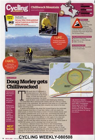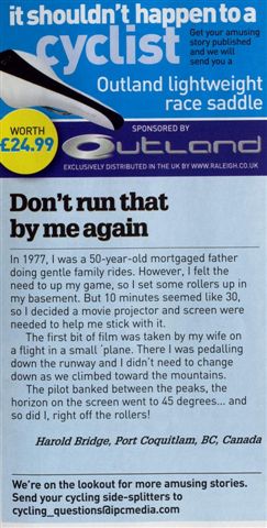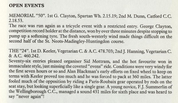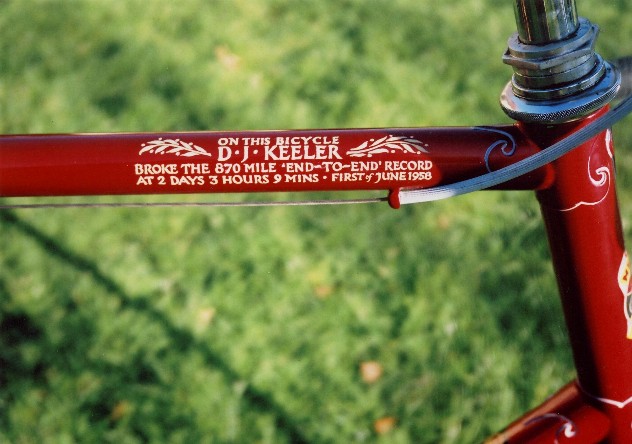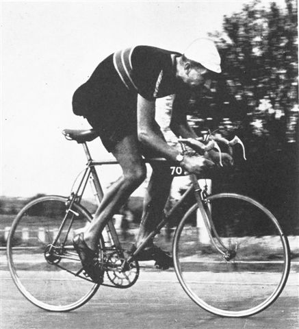 Misc History Harold has sent in a collection of photos along with this message. ...something to do with long-distance records, 24 hour time trials in the UK and touring around Chilliwack. [EF] 2008, June 1st is the 50th anniversary of Dave Keeler's Lands End-John O'Groats record. It was the first beating of the record since pre WW2. Dave was deveastated when his record only stood for a few weeks when Tubby Randell knocked an hour or so off it. Tuillio Campagnlo's first gear (1933) mech comprised 2 levers on the right seat stay. One released the hub QR while other one was used to move the chain while back pedalling half a rev. The upper side of the fork end slots had a rack machined into them & the pinions were mounted on the rear hib spindle. Thus the back & forth movement of the wheel that dealt with chain slack was kept in line. It is amazing that Gino Bartali was able to win the Tour de France using that contrivence. The local connection to the PR gear is that Mike Arscott [Deirdre's dad], a colleague of Keeler's, was supposed to be on the E2E support team. But something got in the way. In 1950 Campag produced a briliant piece of engineering where the 2 functions were combined into one lever. It was named the "Paris-Roubaix" in honour of Fausto Coppi's win of the "Hell of the North" that year. In 1951 Campag followed the lead of the French and British manufacturers by producing a chain tensioning mechanism, the Gran Sport. It was a big advance on the racing gears that preceded it in that the gear levers (originally bar cons) pulled the gear onto bigger sprockets. The old Simplex & Huret gears released the cable when going into a lower gear. Not nearly as positive. The monochrome of Keeler was taken during the 1957 North Road 24. I rode that & finished at the same time keeper as Dave. However, I did 405 miles, Dave; 478. A series of detours that closed at a certain time meat that the field stayed fairly compact until the finishing circuit where a timekeeper was placed every 2 miles with pre-calculated tables. From those the timekeepers staff could assess where riders were at the expiration of their 24 hours. BTW: the info ont' top tube is wrong. 874 miles not 870.