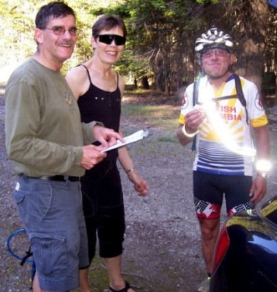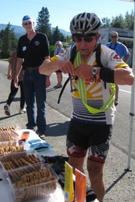 Our Cascade 1200....with Ken As one of the coordinators of the Spring LM 600, I was not surprised to see Ken Bonner's van parked at the start with the curtains drawn when we arrived to set up. Shortly later Ken immerged. I'm not sure when he popped the question, "How would you like to provide support for me on the Cascade 1200?" And I can't say whether it was stupidity or curiosity that led me to say, "Send me some info and I'll give it some thought." Now I have wanted to ride the Cascade this year, but it was wasn't to be. As for supporting Ken, I knew I had to include Sheryl, but she is loath to encourage my rando riding ( the training rides seen to be very hazardous) and to think she'd provide me with support on a long brevet would be beyond rationale thought. Why would I think she'd join me to support Ken? When I shared Ken's e-mails (long e-mails with direction after direction) with her, I'll be darned, she said, "Yes" without hesitation. It must have been the 'star' appeal. On telling Ken we were "in", more detailed info and directives arrived promptly. Wow, talk about organized, talk about the cyclist version of a military campaign. We knew that we were in for quite the experience, well we thought we knew. We meet Ken at Monroe at 3pm to transfer all the support gear from his trusty ( actually dying) van to our car. NASA with their triple redundancy approach to safety and preparedness would have been Then it was off for dinner and our pre-ride briefing. The look at times on Sheryl's face as Ken outlined the 'plan' was... well never mind! Five AM we were up to see Ken and the other 71 riders off. At the first control we mingled with the volunteers and other riders' support crews. Good fun. Everyone was interested in Ken's strategy. He does have quite the reputation. In he came, amongst the first riders. Sheryl recorded the time in. I undid the Camelback straps, Sheryl removed the empty one, threaded the straps of a full one over Ken's arms and I fastened the straps. Ken picked out the food he wanted to carry and was gone. Sheryl recorded the departure time. Our instructions were to insure he was in and out in 5 minutes or less. Mission accomplished. Off we went. It was hard to visualize that a few short miles to the west of the rural routes we were following there was a city of 5 million people. It was starting to warm-up. As we drove from control to control we thought of doing a bit of sight seeing. As things unfolded we were dreaming in technocolour. We did manage a short stop at a beautiful lake for a quick lunch, but that was it. Second guessing when Ken would arrive at a control provided futile. It was getting warmer... no down right HOT!!!!!!!!!!!!!!!!!!!! "Love, was that a secret control?" It was getting really HOT. The control captain had a huge cooler of ice and dozens of tube socks. We began to fill the socks with ice for riders to drape around their necks when they came in. It was early afternoon and White Pass ( 4600') was looming ahead. The thermometer in the car was reading 40+C. This was brutal. The organizers were clearly very concerned. About half way up the Pass they set up an OASIS.... water, watermelon, shade, and encouragement. Ken looked beat, other riders looked finished and a few were! It was about approximately 9pm when Ken reached the designated night stop ( Naches), about rider 4-5 to get in. Same routine, exchange the Camelback, source out food, but now it was prepare for the night riding. Change helmets, install batteries, arm warmers, jacket. Oops, about 15 minutes went by. Ken was off to climb Chinook Pass. He should make the control sometime around 12:30AM. We got there about 11:30, chatted with Mark Thomas (the control volunteer and one of the event coordinators) for a while and then tried to get some sleep (in the car). Some sleep, what sleep? It was then about 18C and it felt COLD. When Ken arrived it was a quick turn around and he headed down. We left about 5 minutes later. Sheryl was surprised how far he had gone before we passed him. Further down the mountain we encountered 3 riders (one on a recumbent) who had decided to ride in the cool of the night rather than the furnace that was to be the next day. We headed for the motel that Ken had booked. Again we tried to sleep. Fat chance. Where is he? He should have been here an hour ago. 4:15 AM, Ken opened the door. He got lost and rode an extra 15 kilometers or so.... no one is immune. We had hauled all the gear into the room and laid out the essentials. Ken picked through the cooler. He showered, he ate, he slept for 45minutes, he was up, dressed, strapped on the Camelback, and, oh........ He was having a freewheel problem. Out I went, it was 5:20AM... it was already HOT. I tested the wheel but couldn't detect the problem. I put the spare wheel on. Ken was concerned about its reliability. It will have to do. By 5:30AM he was gone. It was time to give chase again. We left Yakima and headed east into the Scablands, i.e. the desert with headwinds, hot headwinds. Finally we turned north, it was mid morning and the temperature was 43C. We were really beginning to feel the effects of sleep deprivation. I think it is easier to stay awake when you are physically active than just sitting. The next control was at Mattawa, a farming community on a bench over looking the Columbia River. Trees, wonderful trees..... shade. I found a spot in amongst the Mexican farm workers and did sleep according to Sheryl. We were the only non Mexicans the entire time we were in town waiting for Ken. You talk about hot!!! This was crazy! The next control, Quincey, seemed a million miles away, through mostly nothing. This was also a designated night stop. The volunteers were just setting up when we arrived. Sleep we needed sleep....... oh for a shady tree and there were a few. When Ken arrived (the first) he was clearly feeling the effects of the heat and decided only mad dogs and Englishman were stupid enough to carry on in 