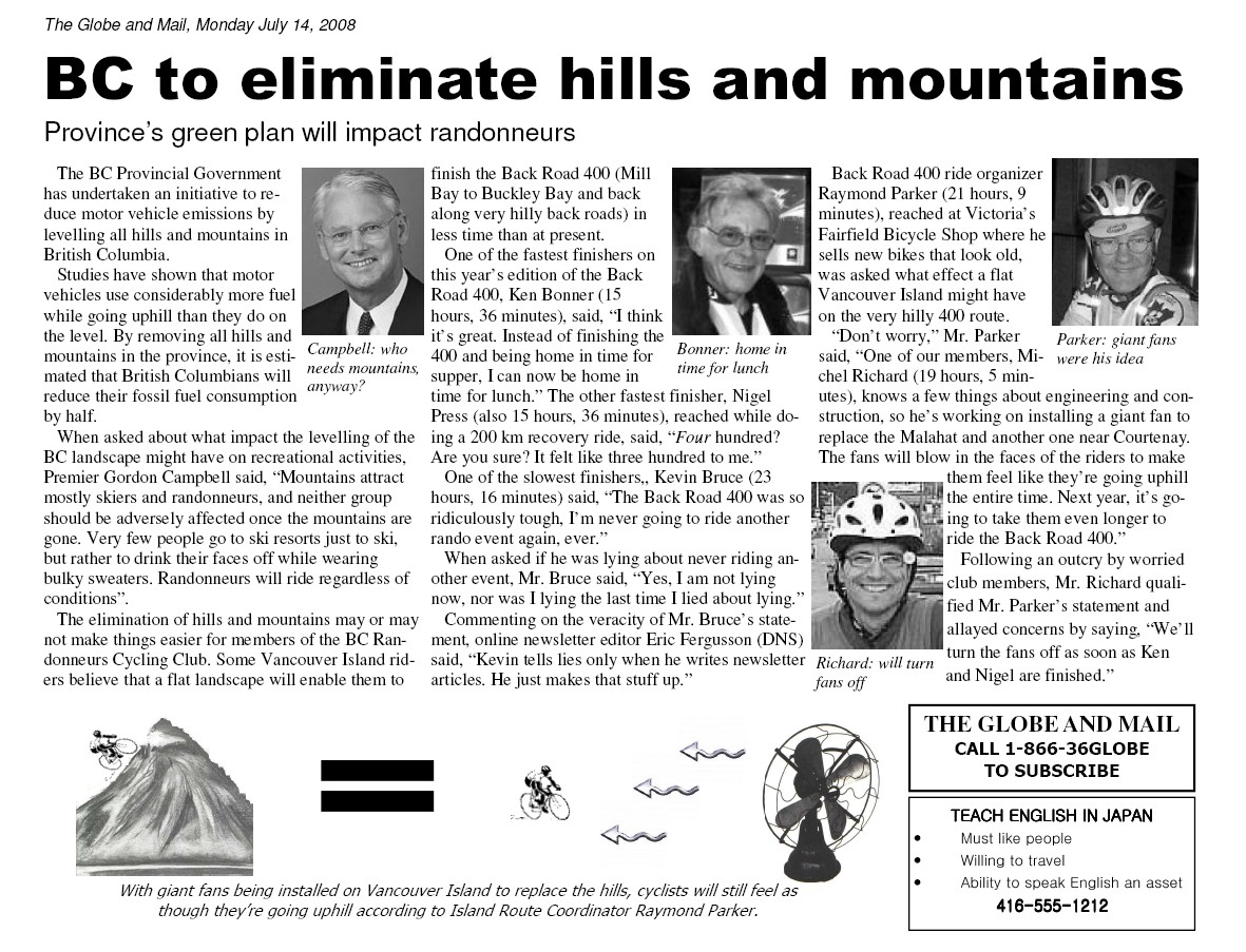BC to eliminate hills and mountains Province's green plan will impact randonneurs provided by Kevin Bruce