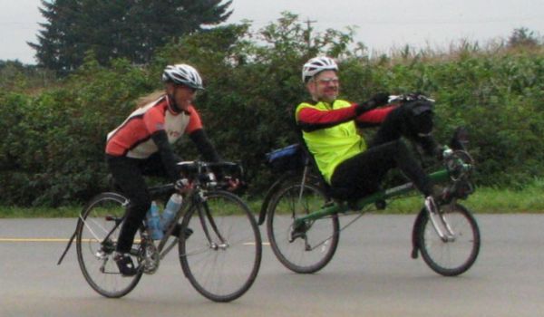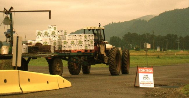 ![]() Photo: Julie Scott-Ashe Harold's report originally appeared on the discussion list. [EF] Flatlander Report Ominus weather on the 20th did little to raise enthusiasm for the following day's Fall Flatlnder 200. Keith & I between us got most of it right. Then he had to dash back home to get the waiver forms! Luckily, Ali got stuck in & helped keep the ball rolling. Some riders got away moreorless at 07:00 & Maple Ridge resident, Alex Pope, treasurer & of Velodrome fame, fell foul of the Albion Ferry only having one boat running at that time of day. He missed it. Not being a triathlete he didn't swim with bike ont' shoulder, he waited for the boat to come back for him. But he got away from the Lion's Hall about 07:20. In all, 36 riders set out on this misnamed "Flatlander". Norm's GPS suggested 745m, but some adjustments might reduce that. After busily pressing hard on 4 carbon copies, Julie Scott-Ashe set forth to the 53km control at Yellow Barn. We didn't see Jack Sharkey, but he got to Pointe Vista despite, I believe, an accident created detour & delay. Enroute to my station at Popkum, I drove the route, to gauge the relative rider spread, before stopping for a chat with Julie. She told me that Premack & Wood had been & gone at 08:40, 6 minutes after opening time. Then for me it was a case of Rte 1 to Popkum & wait the arrival of this speedy duo. 09:57 they appeared, having wasted 13 minutes on opening time. And they didn't dash away, they stayed & conversed through mouthful's of food for all of 2 or 3 minutes. It was then a lonely vigil until more riders appeared. In the meantime I was approached by some guy who asked for a light. I thought about getting one of my LED bike lights out for him, but instead I just told him I quit that in 1944. The fact I forgot to pick up a Rando Sign, a water jug or a can of Gatorade didn't seem to faze anyone until Alard turned up. He is far from being a dwarf. But if he was he would have to be "Grumpy"! The lack of sign was compensated for by parking my white wagon side on to the appraoching riders. With the rear hatch up in the air & with me sitting in the wagon side on we had a clear view of each other. I appreciate the social aspects of randonnees and it was great to see the tailenders of this event enjoying the occasion. But oh, the wait!. But there were no doubts about who hadn't shown up, everyone was was accounted for & I left just after they set off for Pointe Vista. Once past them, I found a discreet place on Annis Road to stand, hidden by a barn so I could get a genuine picture of non-waving cyclists. A non-stop drive back to The Fort found a solitary Event Organiser patiently waiting for the first arrivals. They, Craig Premack & Stuart Wood, turned up while I was waiting for my rather late lunch. I was invited to join them. That cost them because I just happened to have my BC Lung Receipt book with me, another $40 for "Life and Breath"! Everythng seemed to go far too smoothly and sure enough just to spoil the record, Hugo Blad, Larry Voth and Alard Malek were late enough to catch the rain that started a bit too soon. The rail crossing on River Road got Alard & he went down quite heavily & admitted he was doubtful for a moment whether or not he would get up. Anyway, he was in good enough shape to cough up another $50 for the BC Lung Trek (more about that elsewhere). It was a very wet drive home. Lucky eh? On behalf of Keith, thanks to the volunteers for their efforts & for everyone's tolerance about the less than perfect aspects of the event. ![]() Photo: Harold Bridge