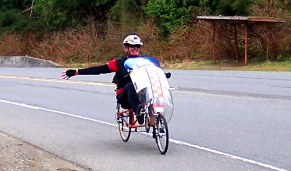 Re: Recumbent Bicycles Ya, I know what you're thinking: "That weirdo guy obviously DNF'd because he rode a recumbent bike. Get a normal bike, you lame-brained recumbent idiot! Your silly lie-down bike makes me angry! No, it makes me laugh - at YOU! Har, har, har!". True, I have been experimenting with various recumbent bikes on brevets and most of them have been too damn slow for randonneuring. Most recumbents are too heavy for brevets and are bad climbers because of too flexy frames and power-absorbing mesh seats. I finally compromised last year and used a semi-fast touring recumbent for Eau de Hell Week. I put all kinds of luxury touring junk on it (like a heavy Lexan front fairing instead of a light carbon fiber one) but it actually completed the 2008 Hell Week despite doing quite a few bonus miles (I think it's the only 'bent to do Hell Week with a winery tour). For the next Hell Week I may actually try a fast and light recumbent (and lose the 20 lbs I am overweight, and maybe do some training). I'll try some puffier tires too. And for everyone who has been making smartypant remarks about my recumbent bikes I would like to point out that I have appeared on recumbents lately not because I have developed some type of mental (as suggested) or physical affliction that prevents me from being normal. I just like riding recumbents. I have been using recumbents for touring for quite a few years. I ride uprights too. I have mostly used uprights for brevets. Recumbents are more fun. These days there are a couple of recumbents available that are just as fast as uprights for brevets and they might even be faster. Certain randosuitable 'bents have come a long way in the last five years and even non-nutbars are starting to ride them on brevets and other ultramarathon events (like RAAM). Smirking brevet boffins may also wish to know that the randonneur with the best time at Paris Brest Paris (Hervé Le Du) is in training to ride a recumbent at the 2011 Paris Brest Paris.