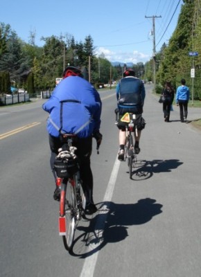 ![]() Dave & Mark en route Photo: Brynne Croy 400 kms - ye gods ! It isn't, or wasn't to me, immediately obvious how many deities may choose to involve themselves in a brevet, but the Highway to Hell pre-ride started to give me some clues. There are some obvious ones, of course: sunshine is always nice, and on Saturday May 9th, Apollo was in fine humour, at least by the time Brynne Croy, Mark Ford and I got to the top of the Malahat, having left the friendly confines of the Ravine Way Timmy's at about 03:00. We continued in fine style to Cassidy, where we were delayed by a puncture to my rear tire, dealt with routinely. This was clearly an omen that ought to have been given more attention, because perhaps a modest sacrifice, possibly the libation of a double-double, might have prevented later disappointments, but that of course is all hindsight. At Nanaimo, Aeolius made his appearance, naturally presenting us with a headwind. But he was apparently conflicted that day, electing to irritate sailors as well as cyclists, and seemed content to keep the breeze light enough that it wouldn't be useful to the nautical fraternity. So while we did work a little harder on the way up to lighthouse country and Union Bay, it could have been much worse. And wonder of wonders, once we had lunched at the heavily fortified and under-staffed Union Bay Market, the wind god maintained his opinion that a northwesterly breeze was the going thing and we actually had it on the tail as we set out on the return legs of the ride. But here, alas, the sensitivities of the lesser-known gods made themselves felt. Who knew there was a god of bicycle tires? Evidently there is, and he was not pleased at lack of attention earlier, because he smote Brynne with a flat almost immediately. Since up to that point I had maintained my usual firm grip on the lanterne rouge, we agreed that the sensible thing was for me to continue on and Mark and Brynne would deal with the tire and catch me up shortly, which would be much more fun that waiting for me at the tops of the hills. It turned out, though, that this was not a simple puncture, but a catastrophic sidewall failure, which would have finished things immediately if not for a folding tire that Mark carries. This required more manipulation and allowed the breakaway to survive to Nanaimo, where it was inevitably reeled in just before dusk. We set off together on the last 100 kms, but the vengeful tire god was not done yet - he once again took it out on Brynne just north of Cassidy, and that put a very unfortunate end to her day, and what had up to that point been a very strong ride. So the sag wagon was called in, and Mark and I continued south into the evening, lured by the prospect of chili at Tim's in Ladysmith. By the time we got to Shawnigan Lake, which is home for me, I was feeling pretty ragged and it's a good thing that I had Mark for company, because the temptation to stop at the house for forty winks might just have done me in. But we carried on, which called for a good deal of patience on Mark's part since by then I was reduced to grannying up anything more than about 2%, but at least I could justify my existence by knowing the local roads! The run down the Malahat was less harrowing than I had feared and we eventually got back to the Ravine Way Tim's just about 24 hrs after leaving - pretty slow, but still the fastest 400 I've done to date!