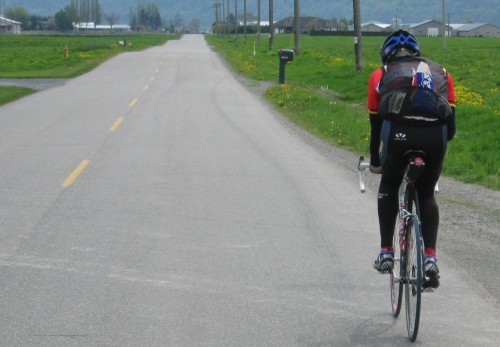 ![]() Here's Luis on his fixed gear bike on the recent Ryder Lake 300. The route includes Nicomen Island... OK, the photo is not from Nicoman Island. Let's just pretend. Photo: Deirdre/Bob Pondering Bike Myths on Nicomen Island Nicomen Island, the 9.5 km stretch of Hwy 7 between Dewdney and Deroche, has got to be the dullest, most mind-numbing piece of boring landscape in all of BC. How can less than 10 km feel like more than 10 miles? One of my favourite rides is from Burnaby to Harrison Hot Springs. A friend drives out and meets me there, and we soak in the hot tub before putting the bike in her car and driving back. I enjoy the climbs on Dewdney Trunk and the swooping descent into Ruskin. The final push over Woodside is satisfying, knowing I'm almost there. But the part I abhor is Nicomen Island. Riding this section solo is not fun. It's not the traffic, although it's usually medium-light, with platoons of vehicles whizzing by at the typical BC 10-20 kmh over the limit. It's also not the wind on this flat, exposed stretch that suggests a pace line would alleviate the constant breeze as well as the pervasive boredom. I think what I don't like about it is what Gertrude Stein once said. No, not the line about how fish need bicycles. What she said about my hometown of Oakland, CA: "There's no there there." There is nothing on Nicomen Island! I spent a large portion of my cycling life riding in circles on velodromes around North America and the Caribbean. You might think this should be boring, but usually you are in a pace line, training at around 40 kmh and racing at around 50 kmh, so you don't really have time to be bored, even when you're circling the track for over an hour in training. But riding by yourself on the track, that's dull. And it feels the same riding over Nicomen Island alone. The best use for stretches of road like Nicomen Island is to achieve quality meditative states, or to ponder great philosophical questions: Here's one: have you ever considered whether it is more efficient to ride in a given gear in a large chainring/large rear cog or in a small chainring/small rear cog combination? Take 75 inches, for example. You can do this in 53x19 (75.3") or 39x14 (75.2"). You'd think they should feel the same, right? In track racing, there is a supposed old wives' tale: sprinters should use a small chainring/small cog combination because it accelerates faster; pursuiters should use a big ring/big cog combo because it's easier to keep it rolling. Sounds like folklore to most people. But here on Nicomen Island, you can not only think about it, you can put it to the test. Let's say you are spinning at 120 rpms. (An aside: if you want to win medals in pursuits, learn to spin a 90" gear at 120 rpms for four to five minutes - that's all it takes!) This is two pedal revolutions per second. The chain has to travel at the same speed as the chainring: 53 times 2 links per second (106 links per second) or 39 times 2 (78 links per second). Think about that in a small/small combination, to get from 0 to 120 rpms, you only need to accelerate that heavy length of chain to about 75% of the speed it would need to go with the big/big combination. But, once you've got the chain moving, you've got this heavy chain maintaining your momentum 36% faster in the big/big combination than in the small/small. How do you apply this to randonneuring? Well, for one thing, climbing is merely one long acceleration. If you can get by with a slower-moving chain for the same speed, always climb in your smallest ring. Once you are on the flats, though, and up to speed, pop it into the big ring and use a big cog in back so you are not overgeared. Another factor to consider is crank length. Riders often equate crank length to leg length, thinking that those with longer legs need longer cranks. Or they think that a longer crank lets you climb in a bigger gear because you have more leverage. This may be true, but you should also think of the downside of a longer crank: for a given pedal rpm, your foot needs to travel faster. This is because you measure speed in two ways around a circle: you can measure angular velocity - how many times you go around the circle in a given time, like rpm's. You can also measure simple linear velocity - rpm's times the circumference of the circle. So, the bigger the circle (longer the crank) for a given angular velocity, the faster the linear velocity. The reason track riders use shorter cranks (like 165's) is not just to avoid scraping the pedal on the banking. It's so that their feet don't have to move as fast at the high pedal cadences used on the track! With a fixed gear on the road, this comes in handy on descents. You can spin at really high cadences, but the actual speed the foot is going is maybe 3% slower per 5 mm of crank length (I was lousy at physics and I forget how I calculated that). Personally, I think for most people on geared bikes crank length tends to be a wash; you don't really notice it, especially if you have long legs. Where it might become important is on a tandem, where you have an experienced driver and an inexperienced stoker. The pilot wants to spin, the stoker likes to plod. So you put 175's on the front and 165's on the back. The front requires more linear foot speed to achieve the same spin, the stoker is a bit more comfortable at a slightly higher rpm because the foot doesn't need to move as fast. Another good place for longer cranks is here on Nicomen Island, grinding a big gear on the big ring and taking advantage of the extra leverage to get the cranks around. When I rode flat time trials, I would sometimes turn 180mm cranks. This might be a good strategy here. Instead of chipping away at Nicomen in a small gear, take big chunks and get it the heck over with.