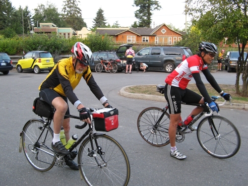 ![]() Harold (left) with Luis Bernhardt at the start Photo: Paul Whaley The "Wannabee" Meets "Bintheredunthat" When Barry Chase revived John Bate's "Whatcom Wambler" 300 a few years ago, I saw it as an attractive route I would like to ride. But accepting the limits imposed by age, I realised all aspects need to be favourable before I would attempt it. Things have been going well this year, 2009, & with 13 weeks with between 300 & 422 kms on the C-KAP weekly chart, & 7,000km halfway through July I felt it was now or never. Whilst it may prove hot (it did) during the afternoon, July 18 looked like it would cooperate. WAt 05:00 I thought it best to use the GEB & donate $3.95 to its construction rather than risk the Albion Ferry like late starter Alex Pope did. Got my route sheet & control card & realised I had forgotten one thing; my magnifying glass! Our control cards have lots of empty space, why such a small font? That is a serious consideration when the elderly are likely to riding 600s & 1000s (don't read too much into that!). With much of the climbing in the first stage there is a need to maintain pressure, especially up that beautiful climb on South Pass Road where I was passed by Richard Blair for the second time. I think he started reading his route sheet after that because I never saw him again. For those who don't know it, South Pass Road goes north east until it bounces off the 49th parallel & becomes south bound Silver Lake Road. Shortly before the bend there were voices behind me, but not ours. Two women, one of whom had ridden STP, took some interest in what I was doing; "You're a what?" I gave them the standard definition of a randonneur; "One part racing cyclist, one part touring cyclist, mixed with one part masochist". They laughed, then shot off into the distance! In my mind the control at Silver Lake Park is "just down the road". But there is a series of rollers that cause out the saddle pounding or serious gear changing. A lonely looking Tracey Barill appeared relieved to see me. The next impediments were; the head wind on Rte#9, the 30 or 40 Harley Davidsons being unnecessarily obnoxious and the sign telling us the Middle Fork Creek Bridge on Mosquito Lake Road was "out" from June 22 '09 to sometime in 2010. What to do? Take a chance that cyclists could get through, (some did & got through) or do a "293" instead of a "300"? My computer had been staying remarkably close to the route sheets distances & so decided at the "R" onto Upper Samish Road to note my distance, compare it with the route sheet & continue south for a suitable distance; 3.7kms & return. But the revised route was 304, not the bare 300 as before & I cut that idea short. I admit that sometimes long rides can get lonely and it was a pleasure to see a control sign on Prairie Road with Ivan Andrews' happy smiling face behind it. The "secret" was required as the original short cut along Parson's Creek Road left us with not enough kms. I rode 200 metres past the Alger control & came to the cross roads wondering where the control was. The newly painted yellow building I had seen was it. I was thankful for a tail wind along there, but not for the Harley's that passed me for the second time on their way to hell (I hope) or wherever. Bellingham, what to do? The heat of the afternoon was having its effect & my speed on climbs was getting pitiful. I had failed to switch my computer to "Manual" so that I could keep an eye on true average speed. At a guess I felt I was still in with a chance, but history & memory were putting doubts in my mind. "Quit while you are ahead" seemed to be a sensible attitude. But I earned the sobriquet "Madbridge" in 1952 & anyway, who wants to be considered sane in this crazy world? But sobriquet's power of persuasion is fading with time & I endeavoured to think of the short way to Fort Langley. Not sure the route I chose was the shortest. But I thought , hoped, someone might be looking for me & by using the route there was more chance of being found. Having to line up with foreigners at the Canada Custom was humiliating & while there the Holts arrived so I didn't feel so quite alone. I had missed the Lummi & Semiahmoo controls & was just hoping for a guardian angel to come & rescue me. But I think my GA is with the paramedics & I had a rather slow but easy ride back to Fort Langley. I was taken by surprise on 72nd Av when Keith Fletcher stepped out from behind his truck & urged me on with "Don't stop!". I didn't , & it was a few minutes later before I realised he didn't know I was DNF! But too late, I rode back to The Fort, & got cold enjoying my Lumicycle halide on the 240 descent . In theory I could have completed. I finished at the Fort at 23:30 with 266kms. HJB 09/07/19