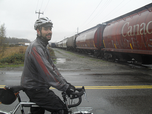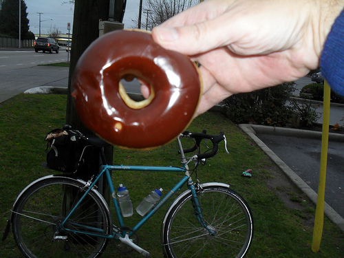 Donuts and Culture Tim Horton was born in Cochrane, Ontario in 1930, played his first NHL game in 1950 and still holds the record for most consecutive games in a Toronto Maple Leafs' uniform at 486. It may be hard to believe, especially for hockey fans under the age of forty, but the Leafs actually used to win Stanley Cups, and Tim Horton was on four of those championship teams. He opened the first Tim Horton's donut shop in Hamilton, Ontario in 1964. At six o'clock in the morning on Sunday November 23, 2009 Ryan Golbeck and I met up at the Tim Horton's restaurant on Commercial Drive for a 200 km permanent brevet; a ride we'd decided to do for no other reason than the dubious goal of completing the requirements for the year-round award. According to the local weather forecasts for the areas through which we'd be riding, the rain would end about 9 am in Vancouver, noon in Abbotsford, and mid-afternoon in Chilliwack. These predictions held true and we thus managed to ride with the rain as it receded inland. We headed out of Vancouver along rain-slicked streets with flattened patches of wet leaves as the sky slowly turned from pitch black to a dark, dull grey. With little ambient noise other than the constant swish of rain water spray from our tires, we quietly slipped through the streets of Burnaby and New Westminster, then crossed the Patullo Bridge to Surrey. The official website of the City of Surrey says, "As the 12th largest city in Canada and the second largest in British Columbia, Surrey is able to offer visitors a rich blend of diverse landscapes, abundant parks, rich cultural opportunities and superb recreational choices." We passed our first Tim Horton's donut shop at the 22 km mark. As we made our way along the Fraser Highway, more Tim Horton's donut shops appeared at 32, 35, 40, and 43 kms, and arrived in the City of Langley whose website claims the city has "a rich cultural heritage". Donut shops here were located at the 47 and 57 km mark. Ryan and I both noticed that there seemed to be more fried chicken outlets than donut shops, so next time I ride this out here I'll note the KFCs and Church's, and may have to re-christen the route 'The Fried Chicken 200'. Either way, the culinary choices in this part of the Lower Mainland seem limited to the types of foods that cause people to gain weight which may partly explain why they all need cars to get around. (One of my all-time favourite short stories is Brian Fawcett's 'The Fat Family Goes to the World's Fair' found in the collection Cambodia: A book for people who find television too slow (Talonbooks, Vancouver, 1986) (It changed my life and it'll change yours, too.) After a virtually car-free ride down Bradner Road to Huntingdon / Vye through Abbotsford, we came to the 13 km stretch of South Parallel Road which runs alongside the motor vehicle madness of the Trans-Canada Highway. Whenever I ride one of the Parallel Roads I regard it as an opportunity to witness first-hand the human tendency to fetishize technologies so clearly evidenced by our dependency on the automobile. Even so, the straight and flat nature of South Parallel Road is a very boring stretch of pavement for cyclists with the possible exception of time-trialists who aren't really cyclists because they wear funny-looking helmets. I'd been concerned about the actual distance of this route because I'd not actually ridden it all in one go but had pieced it together from brevets created by others and the 2008 version of Microsoft's 'Streets and Trips'. As it turned out, when we got to Yarrow, Ryan's odometer read 98.5 km (my odometer had malfunctioned earlier and was way off). So, we rode straight through the town and turned back at the point where we were confident we'd done 100 km giving ourselves a clear conscience. Riding all the way through the town before turning back gave us an opportunity to view our lunch options and we decided upon the Yarrow Deli where the food is good, and the staff consists of three attractive young women to whom a man my age represents neither a threat nor a possibility. ![]() Ryan By two o'clock two things disappeared: the rain and Ryan. As we approached a fairly substantial hill on Vye Road, Ryan chose to make the best time he could back to Vancouver and so we parted at that point and he leapt over the hill like a mountain goat with his ass on fire. I, on the other hand, wishing to savour the experience of being wet and cold as long as possible, shifted into my lowest gear, spun slowly up the hill, and at the crest could barely see Ryan in the distance as he disappeared from view. Back in Langley, with about 50 km to go, I spotted a coin laundry-mat along the Fraser Highway so I decided to take an extended break and dry out my clothes. This, naturally, meant that I had to sit naked in the laundry-mat for about half an hour. Having no clothes on, I began to get chilled, so I climbed into one of the dryers, assumed the lotus position, and spun around for about fifteen minutes all the while chanting, "Hari Rando, Hari Rando, Hari Rando...". When I got out of the dryer, I thought that I might get strange looks from some of the other patrons, but they just carried on as if nothing out of the ordinary had happened. The proprietor, a soft-spoken East Indian fellow named Ravi, explained that what I did is actually a common occurrence in this part of Langley although he had never heard a mantra quite like mine. The last 50 km of the ride were predictable and uneventful, and revealed only one Tim Horton's donut shop that I did not spot on the way out, this one being on the Langley Bypass. Night had fallen by the time I'd reached the Patullo Bridge and crossed into New Westminster, made my way through South Burnaby, and finally back to the Earles Bike Route to Grandview then home to East Van. I remember when I heard the news in 1974 that Tim Horton, the man, the hockey player, the hard-knocking, indestructible Maple Leaf, died in a car crash just 